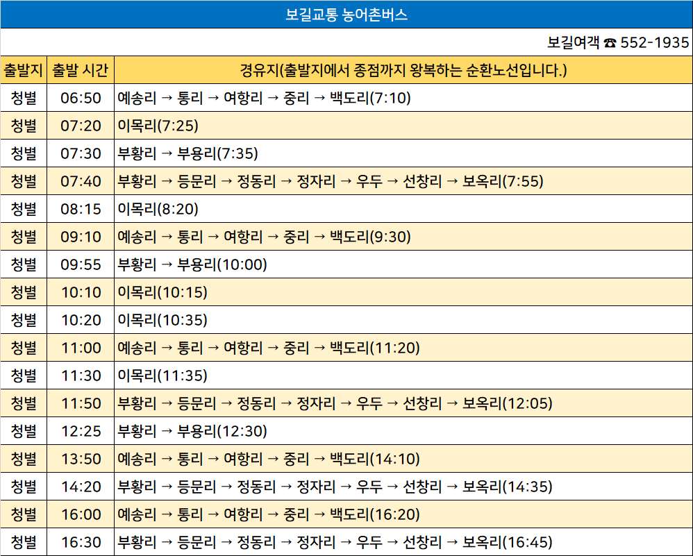●보길교통 농어촌버스 노선정보: 청별 → 예송리 → 통리 → 여항리 → 중리 → 백도리, 청별 → 이목리, 청별 → 부황리 → 부용리, 청별 → 부황리 → 등문리 → 정동리 → 정자리 → 우두 → 선창리 → 보옥리