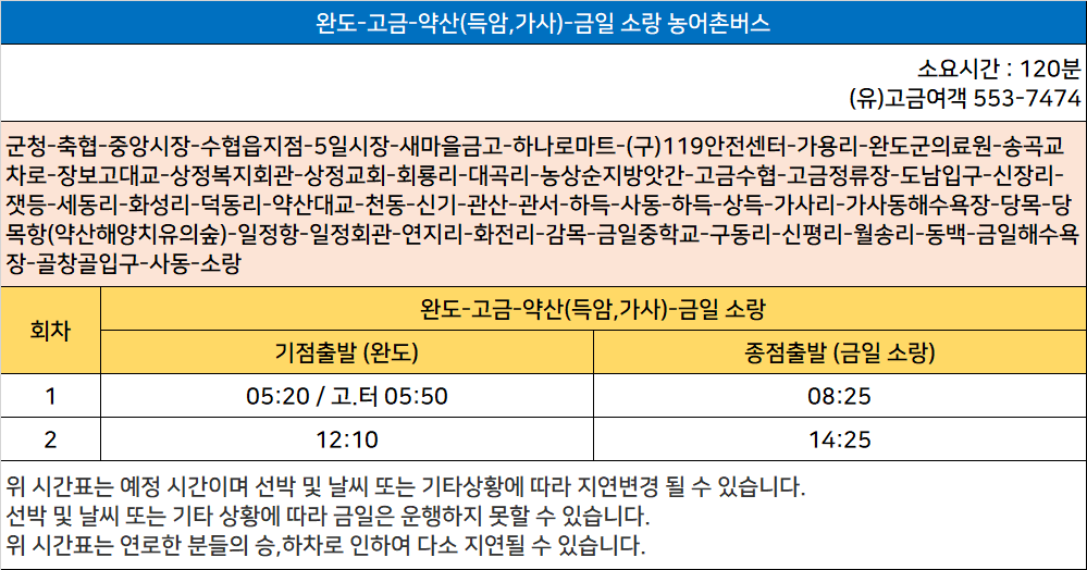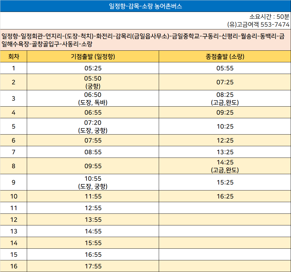 ●일정항-감목-소랑 농어촌버스 노선정보: 일정항-일정회관-연지리-(도장-척치)-화전리-감목리(금일읍사무소)-금일중학교-구동리-신평리-월송리-동백리-금일해수욕장-골창골입구-사동리-소랑