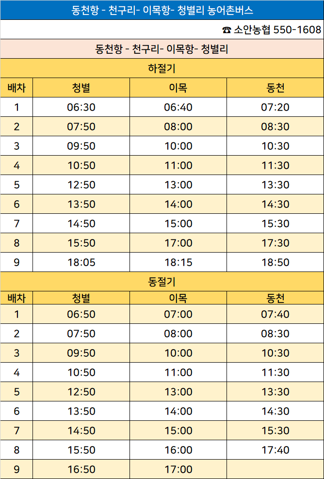 ●동천항 - 천구리- 이목항- 청별리 농어촌버스 노선정보: 동천항 - 천구리- 이목항- 청별리