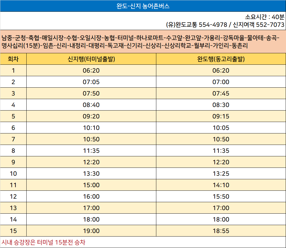 ●완도-신지 농어촌버스 노선정보: 남중-군청-축협-매일시장-수협-오일시장-농협-터미널-하나로마트-수고앞-완고앞-가용리-강독마을-물아테-송곡-명사십리(15분)-임촌-신리-내정리-대평리-독고재-신기리-신상리-신상리학교-월부리-가인리-동촌리