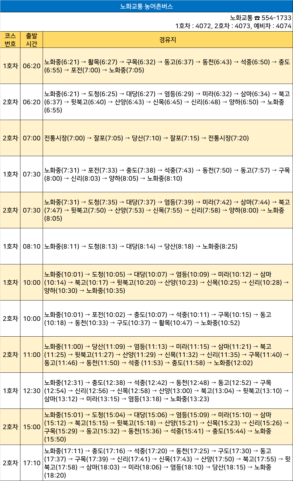 ●노화교통 농어촌버스 노선정보: 노화중 → 활목 → 구목 → 동고 → 동천 → 석중 → 충도 → 포전 → 노화중, 노화중 → 도청 → 대당 → 염등 → 미라 → 삼마 → 북고 → 뒷북고 → 산양 → 신목 → 신리 → 양하 → 노화중, 전통시장 → 잘포 → 당산 → 잘포 → 전통시장, 노화중 → 포전 → 충도 → 석중 → 동천 → 동고 → 구목 → 신리 → 양하 → 노화중, 노화중 → 도청 → 대당 → 당산 → 노화중, 노화중 → 포전 → 충도 → 석중 → 구목 → 동고 → 동천 → 구도 → 활목 → 노화중, 노화중 → 당산 → 염등 → 미라 → 삼마 → 북고 → 뒷북고 → 산양 → 신목 → 신리 → 구목 → 동고 → 동천 → 석중 → 충도 → 노화중, 노화중 → 충도 → 석중 → 동천 → 동고 → 구목 → 신리 → 신목 → 산양 → 북고 → 뒷북고 → 삼마 → 미라 → 염등 → 노화중, 노화중 → 도청 → 대당 → 염등 → 미라 → 삼마 → 북고 → 뒷북고 → 산양 → 신목 → 신리 → 구목 → 동고 → 동천 → 석중 → 충도 → 노화중, 노화중 → 충도 → 석중 → 동천 → 구도 → 동고 → 구목 → 신리 → 신목 → 산양 → 북고 → 뒷북고 → 삼마 → 미라 → 염등 → 당산 → 노화중