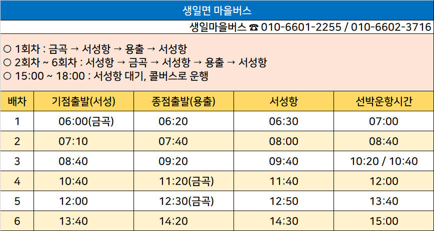 ●생일면 마을버스 노선정보: 금곡 → 서성항 → 용출 → 서성항, 서성항 → 금곡 → 서성항 → 용출 → 서성항