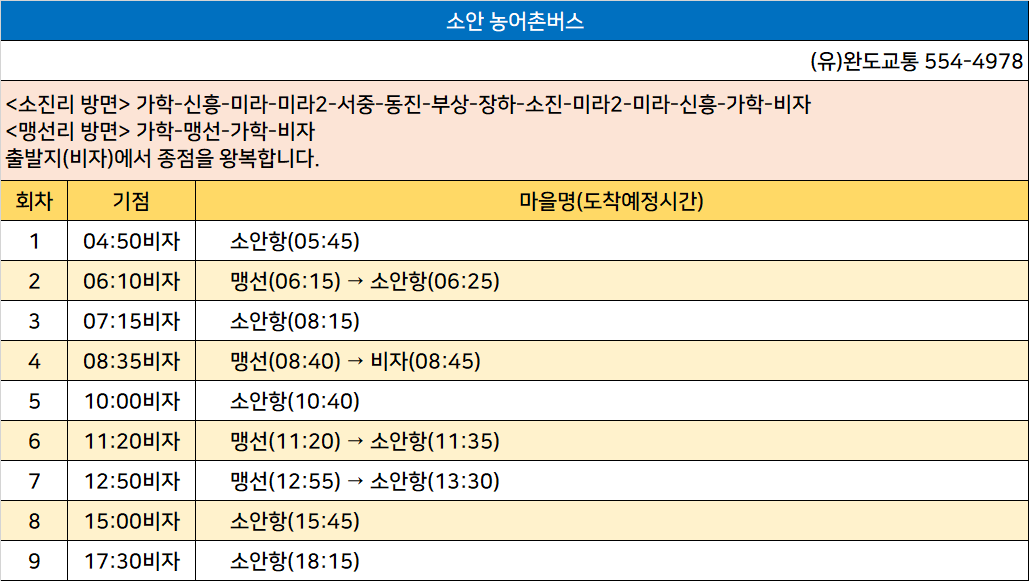 ●소안 농어촌버스 노선정보: <소진리 방면> 가학-신흥-미라-미라2-서중-동진-부상-장하-소진-미라2-미라-신흥-가학-비자 / <맹선리 방면> 가학-맹선-가학-비자
