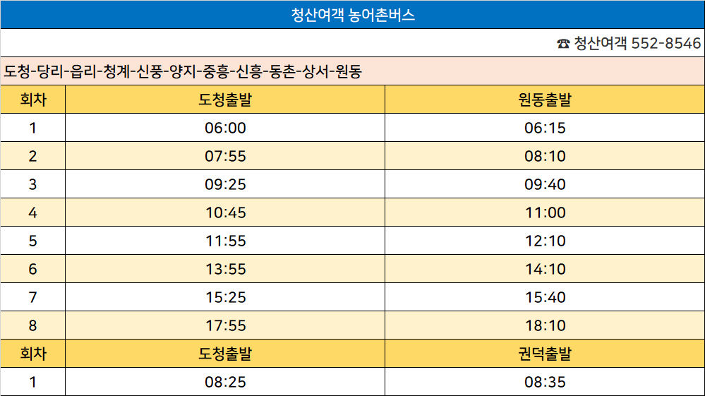 ●청산여객 농어촌버스 노선정보: 도청-당리-읍리-청계-신풍-양지-중흥-신흥-동촌-상서-원동, 권덕