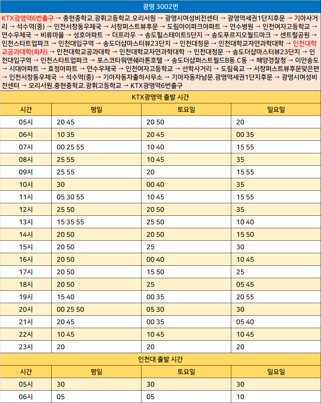 광명 3002번: KTX광명역6번출구 → 충현중학교.광휘고등학교.오리서원 → 광명시여성비전센터 → 광명역세권1단지후문 → 기아사거리 → 석수역(중) → 인천서창동우체국 → 서창퍼스트뷰후문 → 도림아이파크아파트 → 연수병원 → 인천여자고등학교 → 연수우체국 → 비류마을 → 성호아파트 → 더프라우 → 송도힐스테이트5단지 → 송도푸르지오월드마크 → 센트럴공원 → 인천스타트업파크 → 인천대입구역 → 송도더샵마스터뷰23단지 → 인천대정문 → 인천대학교자연과학대학 → 인천대학교공과대학(회차) → 인천대학교공과대학 → 인천대학교자연과학대학 → 인천대정문 → 송도더샵마스터뷰23단지 → 인천대입구역 → 인천스타트업파크 → 포스코타워앤쉐라톤호텔 → 송도더샵퍼스트월드B동.C동 → 해양경찰청 → 이안송도 → 시대아파트 → 효정아파트 → 연수우체국 → 인천여자고등학교 → 선학사거리 → 도림육교 → 서창퍼스트뷰후문맞은편 → 인천서창동우체국 → 석수역(중) → 기아자동차출하사무소 → 기아자동차남문.광명역세권1단지후문 → 광명시여성비전센터 → 오리서원.충현중학교.광휘고등학교 → KTX광명역6번출구