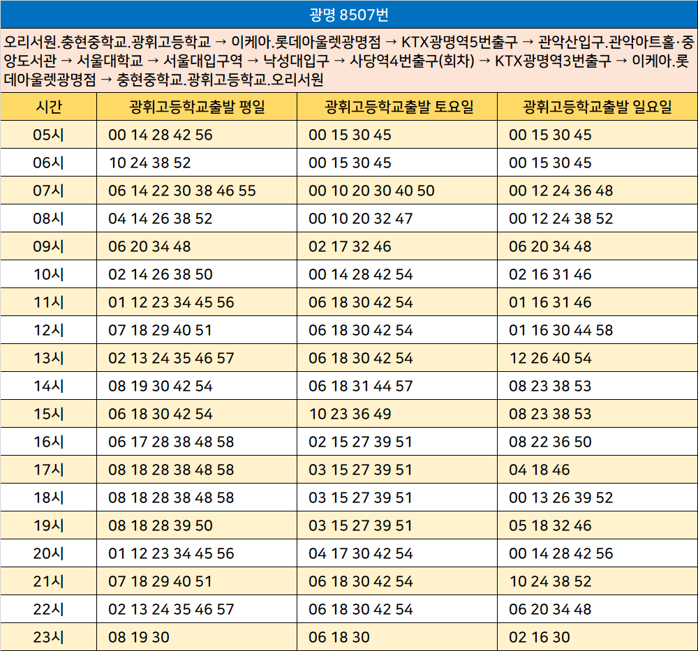 광명 8507번: 오리서원.충현중학교.광휘고등학교 → 이케아.롯데아울렛광명점 → KTX광명역5번출구 → 관악산입구.관악아트홀・중앙도서관 → 서울대학교 → 서울대입구역 → 낙성대입구 → 사당역4번출구(회차) → KTX광명역3번출구 → 이케아.롯데아울렛광명점 → 충현중학교.광휘고등학교.오리서원