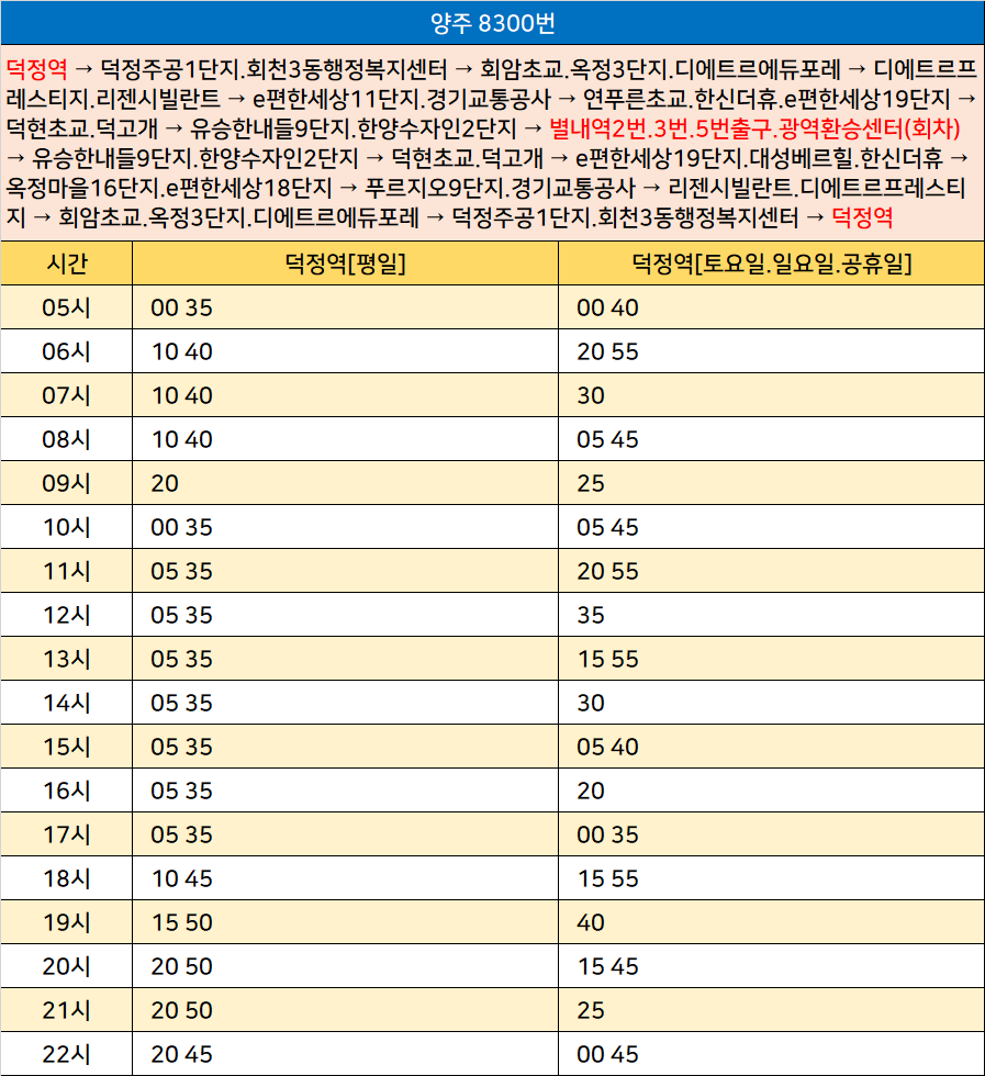 양주 8300번: 덕정역 → 덕정주공1단지.회천3동행정복지센터 → 회암초교.옥정3단지.디에트르에듀포레 → 디에트르프레스티지.리젠시빌란트 → e편한세상11단지.경기교통공사 → 연푸른초교.한신더휴.e편한세상19단지 → 덕현초교.덕고개 → 유승한내들9단지.한양수자인2단지 → 별내역2번.3번.5번출구.광역환승센터(회차) → 유승한내들9단지.한양수자인2단지 → 덕현초교.덕고개 → e편한세상19단지.대성베르힐.한신더휴 → 옥정마을16단지.e편한세상18단지 → 푸르지오9단지.경기교통공사 → 리젠시빌란트.디에트르프레스티지 → 회암초교.옥정3단지.디에트르에듀포레 → 덕정주공1단지.회천3동행정복지센터 → 덕정역