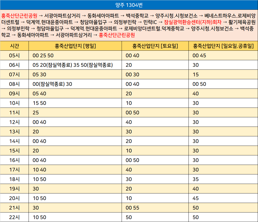 양주 1304번: 홍죽산단근린공원 → 서광아파트삼거리 → 동화세아아파트 → 백석중학교 → 양주시청.시청보건소 → 베네스트하우스.로제비앙더센트럴 → 덕계역.현대윤중아파트 → 청담마을입구 → 의정부민락 → 민락IC → 잠실광역환승센터(지하)회차 → 활기체육공원 → 의정부민락 → 청담마을입구 → 덕계역.현대윤중아파트 → 로제비앙더센트럴.덕계중학교 → 양주시청.시청보건소 → 백석중학교 → 동화세아아파트 → 서광아파트삼거리 → 홍죽산단근린공원