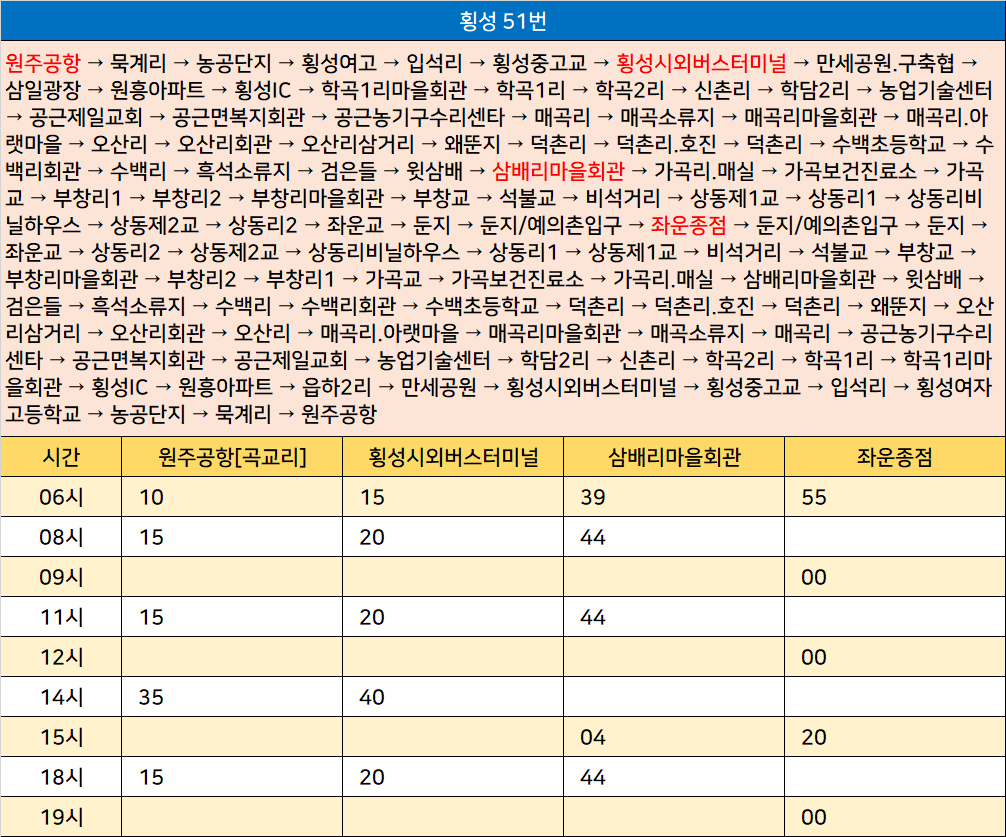 횡성 51번: 원주공항 → 묵계리 → 농공단지 → 횡성여고 → 입석리 → 횡성중고교 → 횡성시외버스터미널 → 만세공원.구축협 → 삼일광장 → 원흥아파트 → 횡성IC → 학곡1리마을회관 → 학곡1리 → 학곡2리 → 신촌리 → 학담2리 → 농업기술센터 → 공근제일교회 → 공근면복지회관 → 공근농기구수리센타 → 매곡리 → 매곡소류지 → 매곡리마을회관 → 매곡리.아랫마을 → 오산리 → 오산리회관 → 오산리삼거리 → 왜뚠지 → 덕촌리 → 덕촌리.호진 → 덕촌리 → 수백초등학교 → 수백리회관 → 수백리 → 흑석소류지 → 검은들 → 윗삼배 → 삼배리마을회관 → 가곡리.매실 → 가곡보건진료소 → 가곡교 → 부창리1 → 부창리2 → 부창리마을회관 → 부창교 → 석불교 → 비석거리 → 상동제1교 → 상동리1 → 상동리비닐하우스 → 상동제2교 → 상동리2 → 좌운교 → 둔지 → 둔지/예의촌입구 → 좌운종점 → 둔지/예의촌입구 → 둔지 → 좌운교 → 상동리2 → 상동제2교 → 상동리비닐하우스 → 상동리1 → 상동제1교 → 비석거리 → 석불교 → 부창교 → 부창리마을회관 → 부창리2 → 부창리1 → 가곡교 → 가곡보건진료소 → 가곡리.매실 → 삼배리마을회관 → 윗삼배 → 검은들 → 흑석소류지 → 수백리 → 수백리회관 → 수백초등학교 → 덕촌리 → 덕촌리.호진 → 덕촌리 → 왜뚠지 → 오산리삼거리 → 오산리회관 → 오산리 → 매곡리.아랫마을 → 매곡리마을회관 → 매곡소류지 → 매곡리 → 공근농기구수리센타 → 공근면복지회관 → 공근제일교회 → 농업기술센터 → 학담2리 → 신촌리 → 학곡2리 → 학곡1리 → 학곡1리마을회관 → 횡성IC → 원흥아파트 → 읍하2리 → 만세공원 → 횡성시외버스터미널 → 횡성중고교 → 입석리 → 횡성여자고등학교 → 농공단지 → 묵계리 → 원주공항