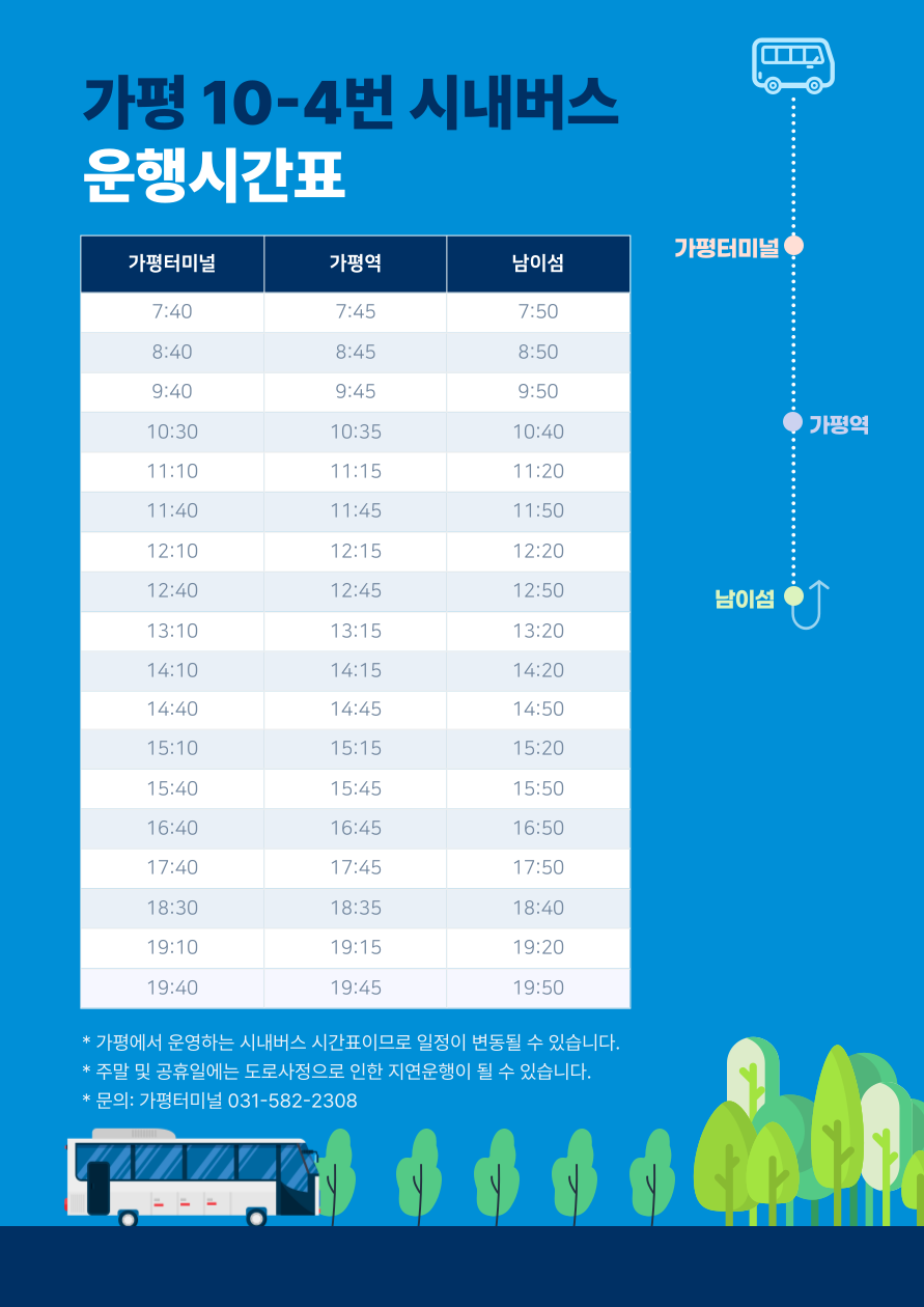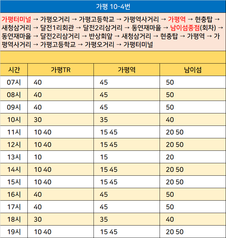 가평 10-4번: 가평터미널 → 가평오거리 → 가평고등학교 → 가평역사거리 → 가평역 → 현충탑 → 새청삼거리 → 달전1리회관 → 달전2리삼거리 → 동연재마을 → 남이섬종점(회차) → 동연재마을 → 달전2리삼거리 → 반상회앞 → 새청삼거리 → 현충탑 → 가평역 → 가평역사거리 → 가평고등학교 → 가평오거리 → 가평터미널