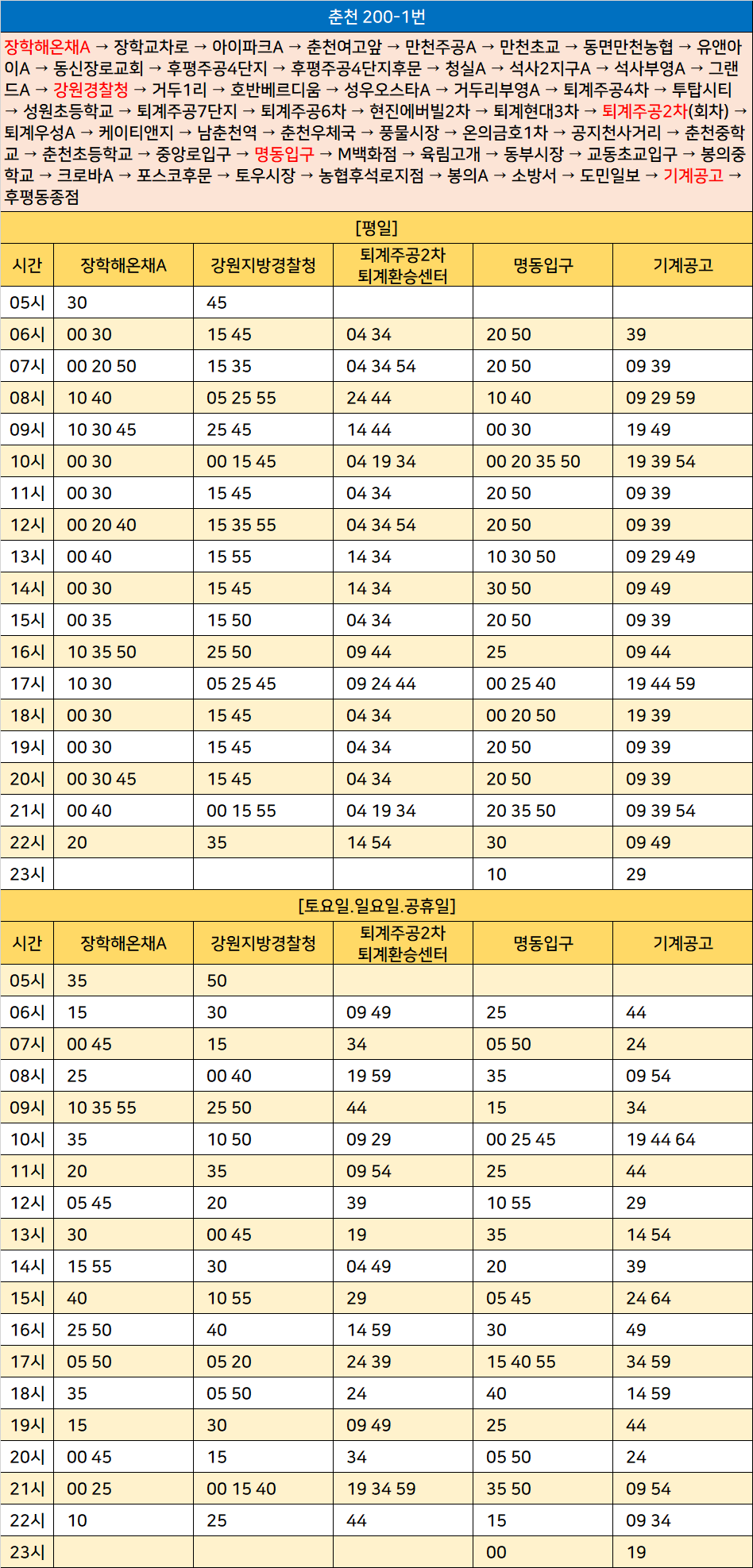춘천 200-1번: 장학해온채A → 장학교차로 → 아이파크A → 춘천여고앞 → 만천주공A → 만천초교 → 동면만천농협 → 유앤아이A → 동신장로교회 → 후평주공4단지 → 후평주공4단지후문 → 청실A → 석사2지구A → 석사부영A → 그랜드A → 강원경찰청 → 거두1리 → 호반베르디움 → 성우오스타A → 거두리부영A → 퇴계주공4차 → 투탑시티 → 성원초등학교 → 퇴계주공7단지 → 퇴계주공6차 → 현진에버빌2차 → 퇴계현대3차 → 퇴계주공2차(회차) → 퇴계우성A → 케이티앤지 → 남춘천역 → 춘천우체국 → 풍물시장 → 온의금호1차 → 공지천사거리 → 춘천중학교 → 춘천초등학교 → 중앙로입구 → 명동입구 → M백화점 → 육림고개 → 동부시장 → 교동초교입구 → 봉의중학교 → 크로바A → 포스코후문 → 토우시장 → 농협후석로지점 → 봉의A → 소방서 → 도민일보 → 기계공고 → 후평동종점