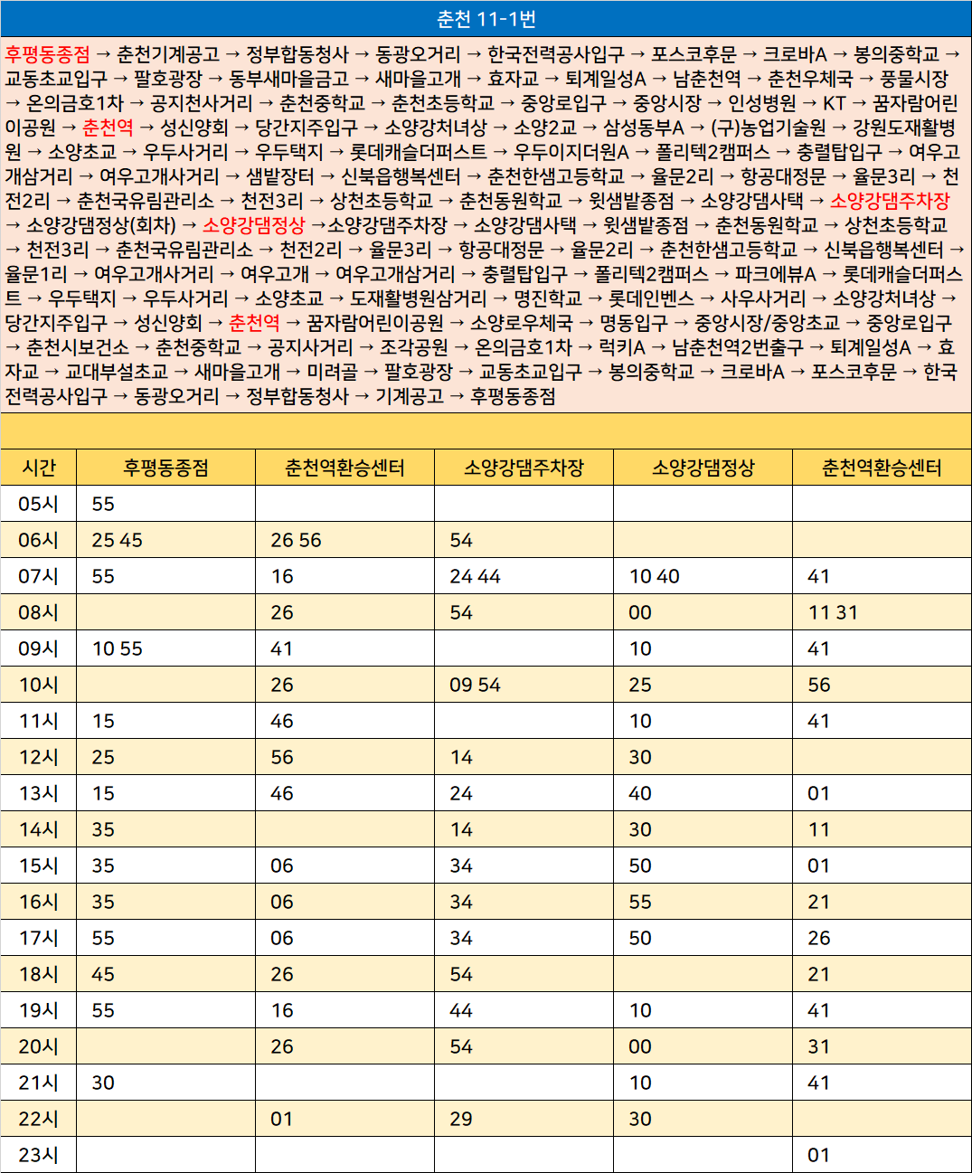 춘천 11-1번: 후평동종점 → 춘천기계공고 → 정부합동청사 → 동광오거리 → 한국전력공사입구 → 포스코후문 → 크로바A → 봉의중학교 → 교동초교입구 → 팔호광장 → 동부새마을금고 → 새마을고개 → 효자교 → 퇴계일성A → 남춘천역 → 춘천우체국 → 풍물시장 → 온의금호1차 → 공지천사거리 → 춘천중학교 → 춘천초등학교 → 중앙로입구 → 중앙시장 → 인성병원 → KT → 꿈자람어린이공원 → 춘천역 → 성신양회 → 당간지주입구 → 소양강처녀상 → 소양2교 → 삼성동부A → (구)농업기술원 → 강원도재활병원 → 소양초교 → 우두사거리 → 우두택지 → 롯데캐슬더퍼스트 → 우두이지더원A → 폴리텍2캠퍼스 → 충렬탑입구 → 여우고개삼거리 → 여우고개사거리 → 샘밭장터 → 신북읍행복센터 → 춘천한샘고등학교 → 율문2리 → 항공대정문 → 율문3리 → 천전2리 → 춘천국유림관리소 → 천전3리 → 상천초등학교 → 춘천동원학교 → 윗샘밭종점 → 소양강댐사택 → 소양강댐주차장 → 소양강댐정상(회차) → 소양강댐정상 →소양강댐주차장 → 소양강댐사택 → 윗샘밭종점 → 춘천동원학교 → 상천초등학교 → 천전3리 → 춘천국유림관리소 → 천전2리 → 율문3리 → 항공대정문 → 율문2리 → 춘천한샘고등학교 → 신북읍행복센터 → 율문1리 → 여우고개사거리 → 여우고개 → 여우고개삼거리 → 충렬탑입구 → 폴리텍2캠퍼스 → 파크에뷰A → 롯데캐슬더퍼스트 → 우두택지 → 우두사거리 → 소양초교 → 도재활병원삼거리 → 명진학교 → 롯데인벤스 → 사우사거리 → 소양강처녀상 → 당간지주입구 → 성신양회 → 춘천역 → 꿈자람어린이공원 → 소양로우체국 → 명동입구 → 중앙시장/중앙초교 → 중앙로입구 → 춘천시보건소 → 춘천중학교 → 공지사거리 → 조각공원 → 온의금호1차 → 럭키A → 남춘천역2번출구 → 퇴계일성A → 효자교 → 교대부설초교 → 새마을고개 → 미려골 → 팔호광장 → 교동초교입구 → 봉의중학교 → 크로바A → 포스코후문 → 한국전력공사입구 → 동광오거리 → 정부합동청사 → 기계공고 → 후평동종점