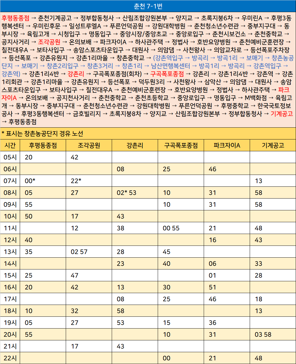 춘천 7-1번: 후평동종점 → 춘천기계공고 → 정부합동청사 → 산림조합강원본부 → 양지교 → 초록지붕6차 → 우미린A → 후평3동행복센터 → 우미린후문 → 일성트루엘A → 푸른언덕공원 → 강원대학병원 → 춘천청소년수련관 → 중부지구대 → 동부시장 → 육림고개 → 시청입구 → 명동입구 → 중앙시장/중앙초교 → 중앙로입구 → 춘천시보건소 → 춘천중학교 → 공지사거리 → 조각공원 → 온의보배 → 파크자이A → 하사관주택 → 정법사 → 호반요양병원 → 춘천예비군훈련장 → 칠전대우A → 보타사입구 → 송암스포츠타운입구 → 대원사 → 의암댐 → 사천왕사 → 의암교차로 → 등선폭포주차장 → 등선폭포 → 강촌유원지 → 강촌1리마을 → 창촌중학교 → (강촌역입구 → 방곡리 → 방곡1리 → 보매기 → 창촌농공단지 → 보매기 → 창촌2리입구 → 창촌3거리 → 창촌1리 → 남산면행복센터 → 방곡1리 → 방곡리 → 강촌역입구 → 강촌역) → 강촌1리4반 → 강촌리 → 구곡폭포종점(회차) → 구곡폭포종점 → 강촌리 → 강촌1리4반 → 강촌역 → 강촌1리회관 → 강촌1리마을 → 강촌유원지 → 등선폭포 → 덕두원3리 → 사천왕사 → 삼악산 → 의암댐 → 대원사 → 송암스포츠타운입구 → 보타사입구 → 칠전대우A → 춘천예비군훈련장 → 호반요양병원 → 정법사 → 하사관주택 → 파크자이A → 온의보배 → 공지천사거리 → 춘천중학교 → 춘천초등학교 → 중앙로입구 → 명동입구 → M백화점 → 육림고개 → 동부시장 → 중부지구대 → 춘천청소년수련관 → 강원대학병원 → 푸른언덕공원 → 후평중학교 → 한국국토정보공사 → 후평3동행복센터 → 금호빌리지 → 초록지붕8차 → 양지교 → 산림조합강원본부 → 정부합동청사 → 기계공고 → 후평동종점