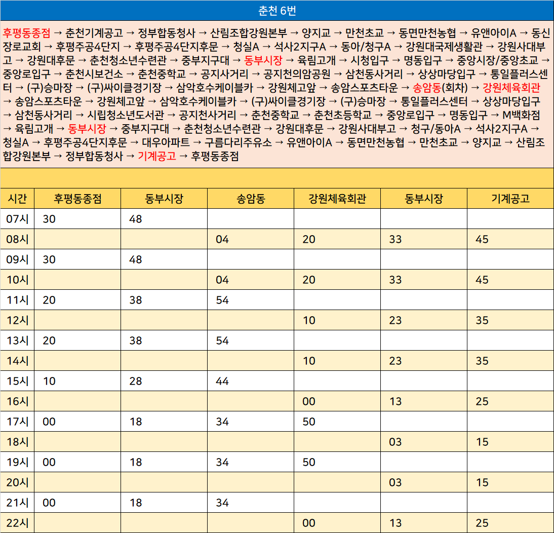 춘천 6번: 후평동종점 → 춘천기계공고 → 정부합동청사 → 산림조합강원본부 → 양지교 → 만천초교 → 동면만천농협 → 유앤아이A → 동신장로교회 → 후평주공4단지 → 후평주공4단지후문 → 청실A → 석사2지구A → 동아/청구A → 강원대국제생활관 → 강원사대부고 → 강원대후문 → 춘천청소년수련관 → 중부지구대 → 동부시장 → 육림고개 → 시청입구 → 명동입구 → 중앙시장/중앙초교 → 중앙로입구 → 춘천시보건소 → 춘천중학교 → 공지사거리 → 공지천의암공원 → 삼천동사거리 → 상상마당입구 → 통일플러스센터 → (구)승마장 → (구)싸이클경기장 → 삼악호수케이블카 → 강원체고앞 → 송암스포츠타운 → 송암동(회차) → 강원체육회관 → 송암스포츠타운 → 강원체고앞 → 삼악호수케이블카 → (구)싸이클경기장 → (구)승마장 → 통일플러스센터 → 상상마당입구 → 삼천동사거리 → 시립청소년도서관 → 공지천사거리 → 춘천중학교 → 춘천초등학교 → 중앙로입구 → 명동입구 → M백화점 → 육림고개 → 동부시장 → 중부지구대 → 춘천청소년수련관 → 강원대후문 → 강원사대부고 → 청구/동아A → 석사2지구A → 청실A → 후평주공4단지후문 → 대우아파트 → 구름다리주유소 → 유앤아이A → 동면만천농협 → 만천초교 → 양지교 → 산림조합강원본부 → 정부합동청사 → 기계공고 → 후평동종점