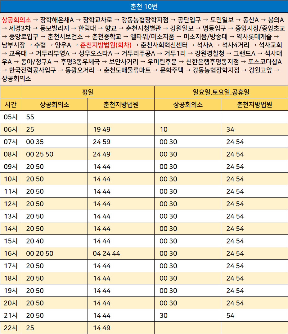 춘천 10번: 상공회의소 → 장학해온채A → 장학교차로 → 강동농협장학지점 → 공단입구 → 도민일보 → 동산A → 봉의A → 세경3차 → 동보빌리지 → 한림대 → 향교 → 춘천시청별관 → 강원일보 → 명동입구 → 중앙시장/중앙초교 → 중앙로입구 → 춘천시보건소 → 춘천중학교 → 엘타워/미소지움 → 미소지움/방송대 → 약사롯데캐슬 → 남부시장 → 수협 → 양우A → 춘천지방법원(회차) → 춘천사회혁신센터 → 석사A → 석사4거리 → 석사교회 → 교육대 → 거두리부영A → 성우오스타A → 거두리주공A → 거두1리 → 강원경찰청 → 그랜드A → 석사대우A → 동아/청구A → 후평3동우체국 → 보안사거리 → 우미린후문 → 신한은행후평동지점 → 포스코더샵A → 한국전력공사입구 → 동광오거리 → 춘천도매물류마트 → 문화주택 → 강동농협장학지점 → 강원고앞 → 상공회의소