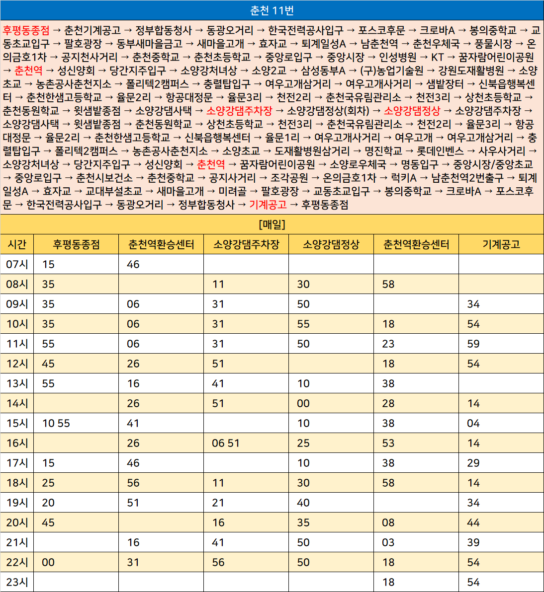 춘천 11번: 후평동종점 → 춘천기계공고 → 정부합동청사 → 동광오거리 → 한국전력공사입구 → 포스코후문 → 크로바A → 봉의중학교 → 교동초교입구 → 팔호광장 → 동부새마을금고 → 새마을고개 → 효자교 → 퇴계일성A → 남춘천역 → 춘천우체국 → 풍물시장 → 온의금호1차 → 공지천사거리 → 춘천중학교 → 춘천초등학교 → 중앙로입구 → 중앙시장 → 인성병원 → KT → 꿈자람어린이공원 → 춘천역 → 성신양회 → 당간지주입구 → 소양강처녀상 → 소양2교 → 삼성동부A → (구)농업기술원 → 강원도재활병원 → 소양초교 → 농촌공사춘천지소 → 폴리텍2캠퍼스 → 충렬탑입구 → 여우고개삼거리 → 여우고개사거리 → 샘밭장터 → 신북읍행복센터 → 춘천한샘고등학교 → 율문2리 → 항공대정문 → 율문3리 → 천전2리 → 춘천국유림관리소 → 천전3리 → 상천초등학교 → 춘천동원학교 → 윗샘밭종점 → 소양강댐사택 → 소양강댐주차장 → 소양강댐정상(회차) → 소양강댐정상 → 소양강댐주차장 → 소양강댐사택 → 윗샘밭종점 → 춘천동원학교 → 상천초등학교 → 천전3리 → 춘천국유림관리소 → 천전2리 → 율문3리 → 항공대정문 → 율문2리 → 춘천한샘고등학교 → 신북읍행복센터 → 율문1리 → 여우고개사거리 → 여우고개 → 여우고개삼거리 → 충렬탑입구 → 폴리텍2캠퍼스 → 농촌공사춘천지소 → 소양초교 → 도재활병원삼거리 → 명진학교 → 롯데인벤스 → 사우사거리 → 소양강처녀상 → 당간지주입구 → 성신양회 → 춘천역 → 꿈자람어린이공원 → 소양로우체국 → 명동입구 → 중앙시장/중앙초교 → 중앙로입구 → 춘천시보건소 → 춘천중학교 → 공지사거리 → 조각공원 → 온의금호1차 → 럭키A → 남춘천역2번출구 → 퇴계일성A → 효자교 → 교대부설초교 → 새마을고개 → 미려골 → 팔호광장 → 교동초교입구 → 봉의중학교 → 크로바A → 포스코후문 → 한국전력공사입구 → 동광오거리 → 정부합동청사 → 기계공고 → 후평동종점
