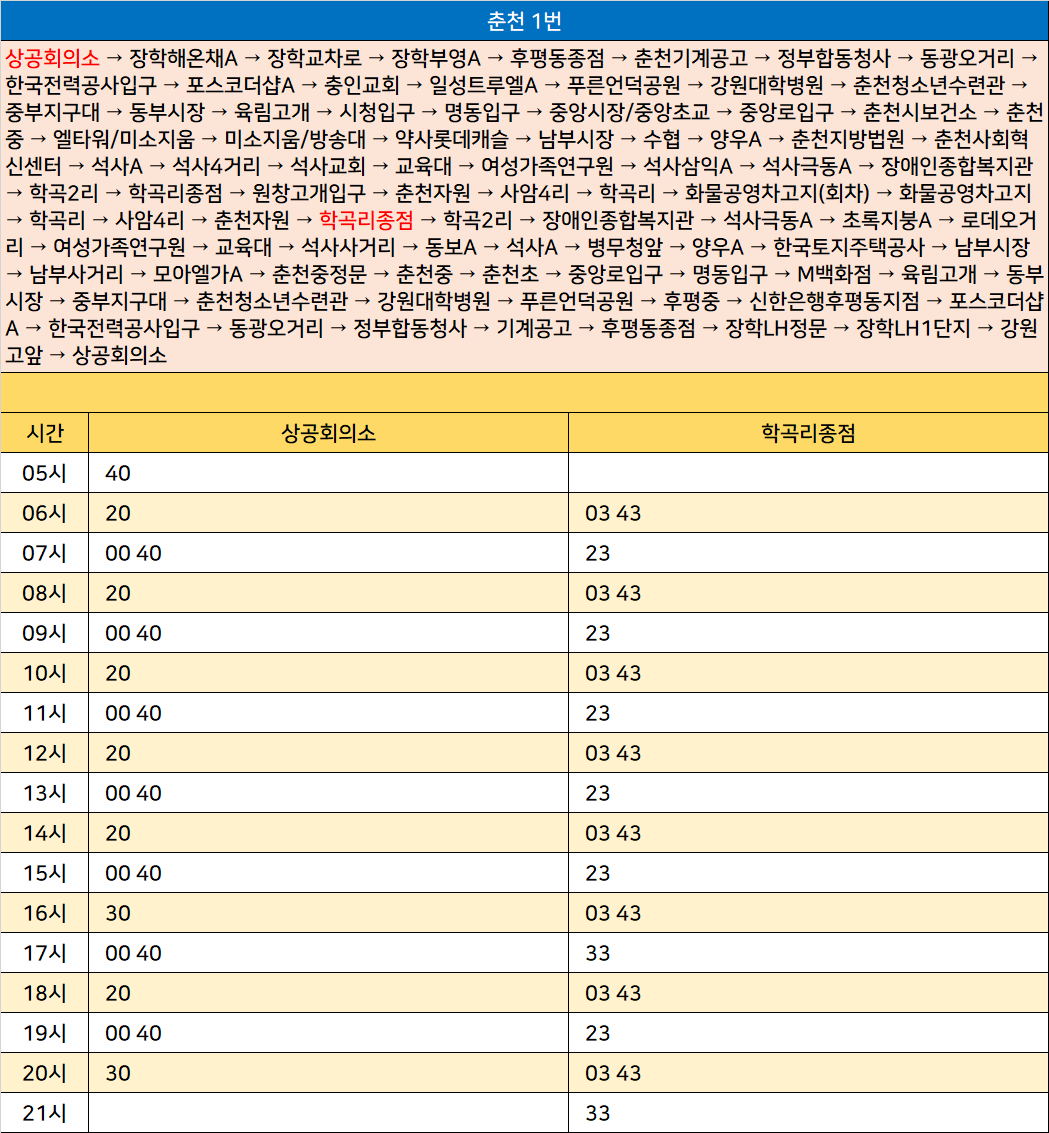 춘천 1번: 상공회의소 → 장학해온채A → 장학교차로 → 장학부영A → 후평동종점 → 춘천기계공고 → 정부합동청사 → 동광오거리 → 한국전력공사입구 → 포스코더샵A → 충인교회 → 일성트루엘A → 푸른언덕공원 → 강원대학병원 → 춘천청소년수련관 → 중부지구대 → 동부시장 → 육림고개 → 시청입구 → 명동입구 → 중앙시장/중앙초교 → 중앙로입구 → 춘천시보건소 → 춘천중 → 엘타워/미소지움 → 미소지움/방송대 → 약사롯데캐슬 → 남부시장 → 수협 → 양우A → 춘천지방법원 → 춘천사회혁신센터 → 석사A → 석사4거리 → 석사교회 → 교육대 → 여성가족연구원 → 석사삼익A → 석사극동A → 장애인종합복지관 → 학곡2리 → 학곡리종점 → 원창고개입구 → 춘천자원 → 사암4리 → 학곡리 → 화물공영차고지(회차) → 화물공영차고지 → 학곡리 → 사암4리 → 춘천자원 → 학곡리종점 → 학곡2리 → 장애인종합복지관 → 석사극동A → 초록지붕A → 로데오거리 → 여성가족연구원 → 교육대 → 석사사거리 → 동보A → 석사A → 병무청앞 → 양우A → 한국토지주택공사 → 남부시장 → 남부사거리 → 모아엘가A → 춘천중정문 → 춘천중 → 춘천초 → 중앙로입구 → 명동입구 → M백화점 → 육림고개 → 동부시장 → 중부지구대 → 춘천청소년수련관 → 강원대학병원 → 푸른언덕공원 → 후평중 → 신한은행후평동지점 → 포스코더샵A → 한국전력공사입구 → 동광오거리 → 정부합동청사 → 기계공고 → 후평동종점 → 장학LH정문 → 장학LH1단지 → 강원고앞 → 상공회의소