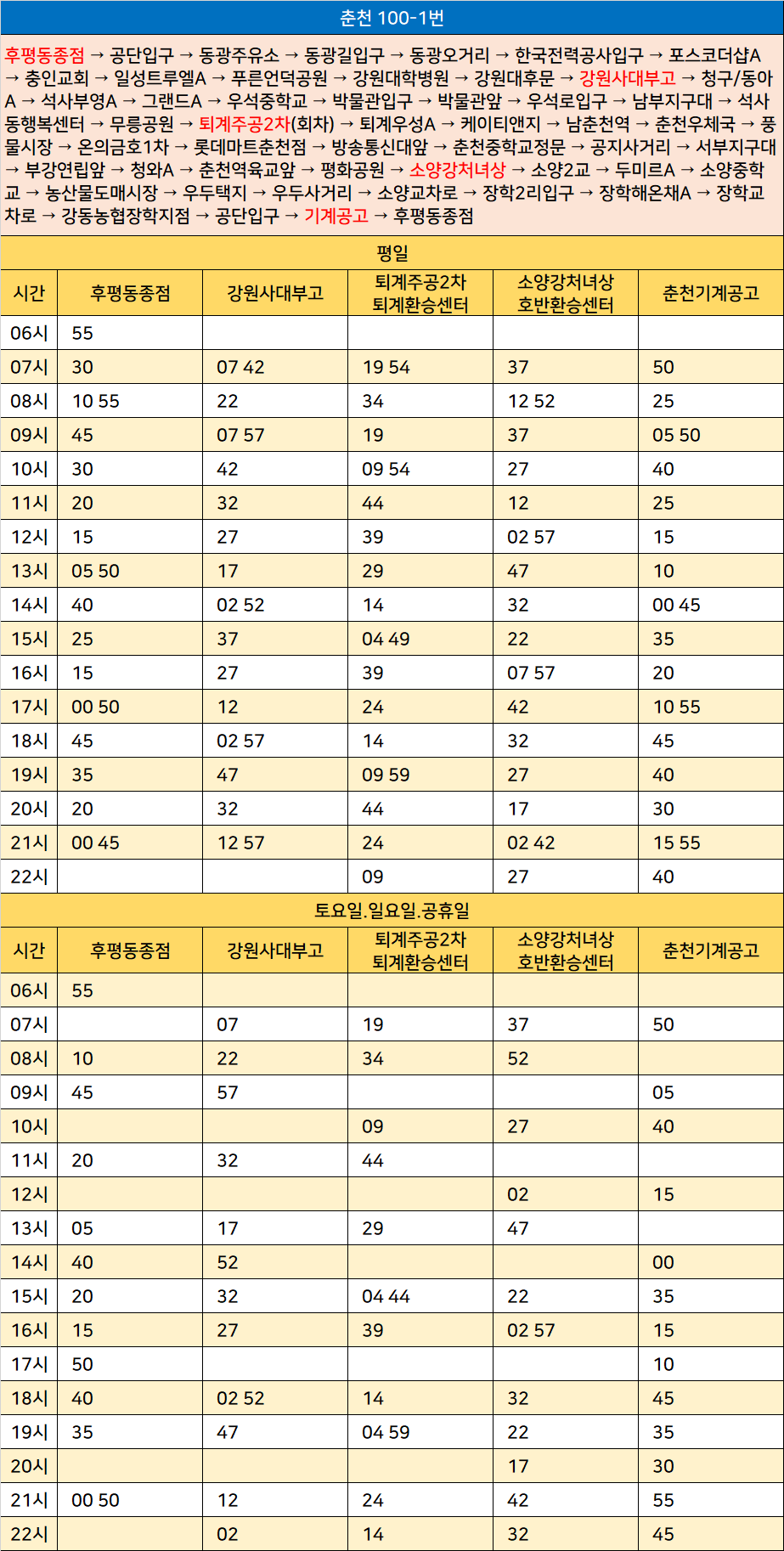 춘천 100-1번: 후평동종점 → 공단입구 → 동광주유소 → 동광길입구 → 동광오거리 → 한국전력공사입구 → 포스코더샵A → 충인교회 → 일성트루엘A → 푸른언덕공원 → 강원대학병원 → 강원대후문 → 강원사대부고 → 청구/동아A → 석사부영A → 그랜드A → 우석중학교 → 박물관입구 → 박물관앞 → 우석로입구 → 남부지구대 → 석사동행복센터 → 무릉공원 → 퇴계주공2차(회차) → 퇴계우성A → 케이티앤지 → 남춘천역 → 춘천우체국 → 풍물시장 → 온의금호1차 → 롯데마트춘천점 → 방송통신대앞 → 춘천중학교정문 → 공지사거리 → 서부지구대 → 부강연립앞 → 청와A → 춘천역육교앞 → 평화공원 → 소양강처녀상 → 소양2교 → 두미르A → 소양중학교 → 농산물도매시장 → 우두택지 → 우두사거리 → 소양교차로 → 장학2리입구 → 장학해온채A → 장학교차로 → 강동농협장학지점 → 공단입구 → 기계공고 → 후평동종점
