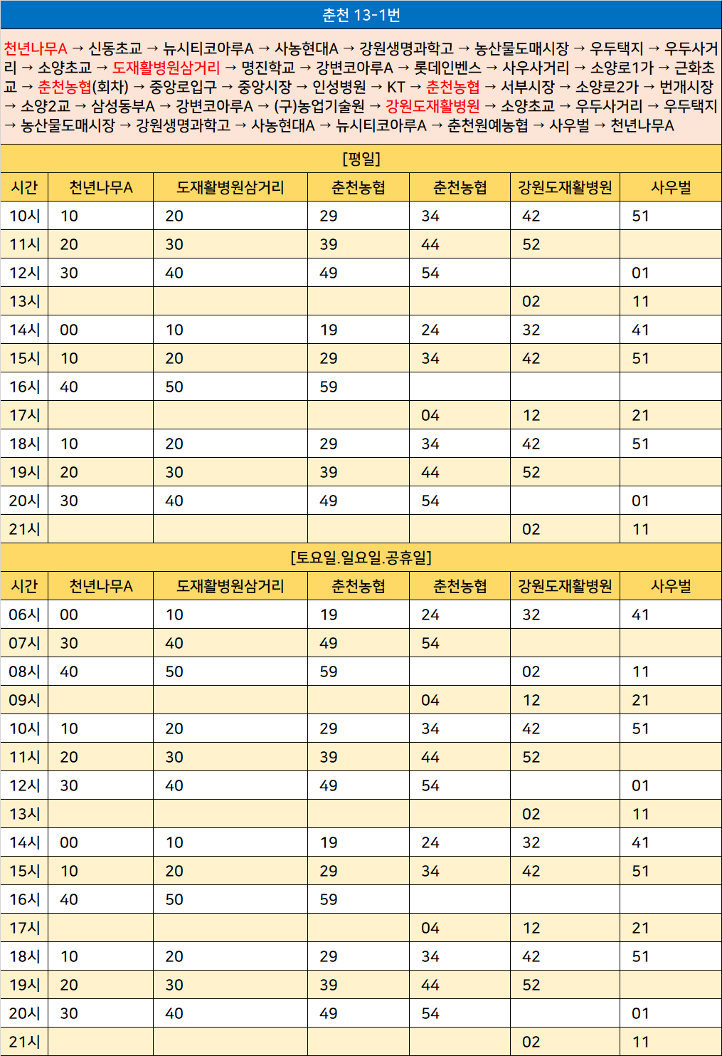 춘천 13-1번: 천년나무A → 신동초교 → 뉴시티코아루A → 사농현대A → 강원생명과학고 → 농산물도매시장 → 우두택지 → 우두사거리 → 소양초교 → 도재활병원삼거리 → 명진학교 → 강변코아루A → 롯데인벤스 → 사우사거리 → 소양로1가 → 근화초교 → 춘천농협(회차) → 중앙로입구 → 중앙시장 → 인성병원 → KT → 춘천농협 → 서부시장 → 소양로2가 → 번개시장 → 소양2교 → 삼성동부A → 강변코아루A → (구)농업기술원 → 강원도재활병원 → 소양초교 → 우두사거리 → 우두택지 → 농산물도매시장 → 강원생명과학고 → 사농현대A → 뉴시티코아루A → 춘천원예농협 → 사우벌 → 천년나무A