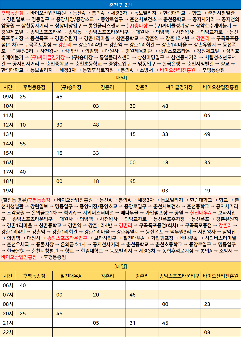춘천 7번: 후평동종점 → 춘천기계공고 → 정부합동청사 → 산림조합강원본부 → 양지교 → 초록지붕6차 → 우미린A → 후평3동행복센터 → 후평주공7단지 → 후평주공6단지 → 후평주공5단지 → 강원대후문 → 춘천청소년수련관 → 중부지구대 → 동부시장 → 육림고개 → 시청입구 → 명동입구 → 중앙시장/중앙초교 → 중앙로입구 → 춘천시보건소 → 춘천중학교 → 공지사거리 → 조각공원 → 온의금호1차 → 럭키A → 시외버스터미널 → 배나무골 → 가압펌프장 → 공원 → 칠전대우A → 보타사입구 → 송암스포츠타운입구 → 대원사 → 의암댐 → 사천왕사 → 의암교차로 → 등선폭포주차장 → 등선폭포 → 강촌유원지 → 강촌1리마을 → 창촌중학교 → 강촌역 → 강촌1리4반 → 강촌리 → 구곡폭포종점(회차) → 구곡폭포종점 → 강촌리 → 강촌1리4반 → 강촌역 → 강촌1리회관 → 강촌1리마을 → 강촌유원지 → 등선폭포 → 덕두원3리 → 사천왕사 → 삼악산 → 의암댐 → 대원사 → 송암스포츠타운입구 → 보타사입구 → 칠전대우A → 가압펌프장 → 배나무골 → 시외버스터미널 → 춘천우체국 → 풍물시장 → 온의금호1차 → 공지천사거리 → 춘천중학교 → 춘천초등학교 → 중앙로입구 → 명동입구 → M백화점 → 육림고개 → 동부시장 → 중부지구대 → 춘천청소년수련관 → 강원대후문 → 사대부고 → 후평주공6단지 → 후평주공7단지 → 후평3동행복센터 → 금호빌리지 → 초록지붕8차 → 양지교 → 산림조합강원본부 → 정부합동청사 → 기계공고 → 후평동종점