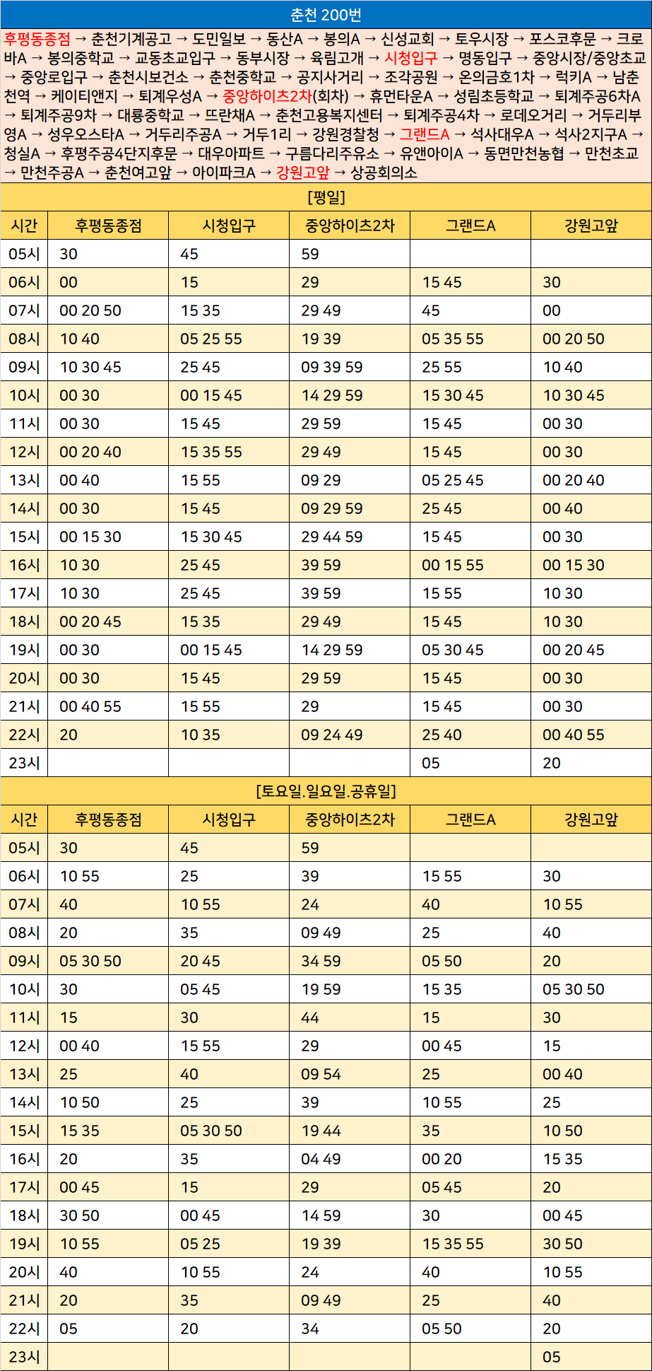 춘천 시내버스 시간표 2025년 05월 04일 기준