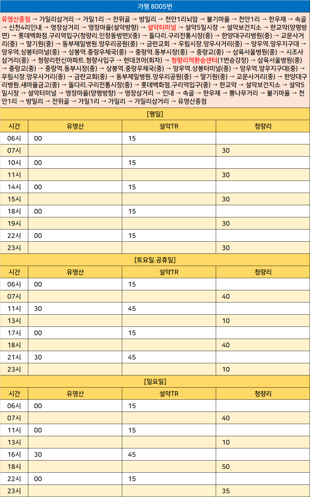 가평 8005번: 유명산종점 → 가일리삼거리 → 가일1리 → 전위골 → 방일리 → 천안1리뇌암 → 불기마을 → 천안1리 → 한우재 → 속골 → 신천4리인내 → 명장삼거리 → 명장마을(설악방향) → 설악터미널 → 설악5일시장 → 설악보건지소 → 한교막(양평방면) → 롯데백화점.구리역입구(청량리.인창동방면)(중) → 돌다리.구리전통시장(중) → 한양대구리병원(중) → 교문사거리(중) → 딸기원(중) → 동부제일병원.망우리공원(중) → 금란교회 → 우림시장.망우사거리(중) → 망우역.망우지구대 → 망우역.상봉터미널(중) → 상봉역.중랑우체국(중) → 중랑역.동부시장(중) → 중랑교(중) → 삼육서울병원(중) → 시조사삼거리(중) → 청랑리한신아파트.청량사입구 → 현대코아(회차) → 청량리역환승센터(1번승강장) → 삼육서울병원(중) → 중랑교(중) → 중랑역.동부시장(중) → 상봉역.중랑우체국(중) → 망우역.상봉터미널(중) → 망우역.망우지구대(중) → 우림시장.망우사거리(중) → 금란교회(중) → 동부제일병원.망우리공원(중) → 딸기원(중) → 교문사거리(중) → 한양대구리병원.새마을금고(중) → 돌다리.구리전통시장(중) → 롯데백화점.구리역입구(중) → 한교막 → 설악보건지소 → 설악5일시장 → 설악터미널 → 명장마을(양평방향) → 명장삼거리 → 인내 → 속골 → 한우재 → 뽕나무거리 → 불기마을 → 천안1리 → 방일리 → 전위골 → 가일1리 → 가일리 → 가일리삼거리 → 유명산종점