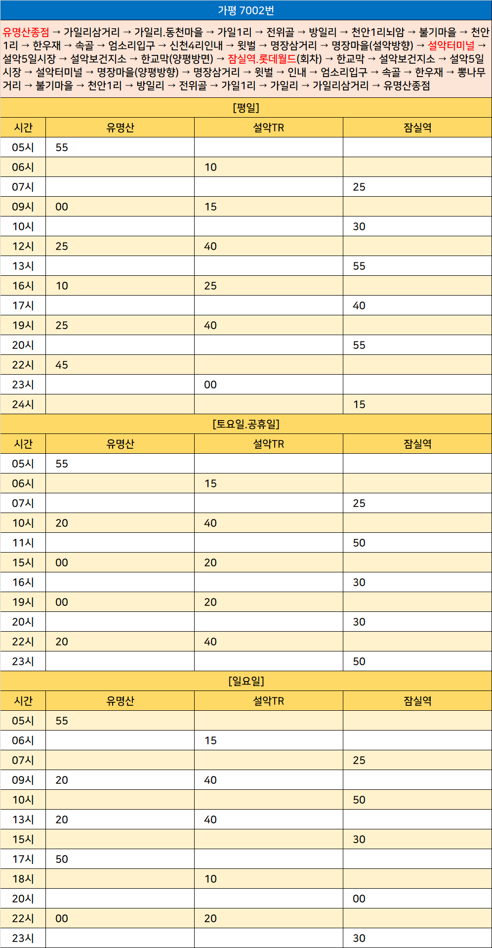 가평 7002번: 유명산종점 → 가일리삼거리 → 가일리.동천마을 → 가일1리 → 전위골 → 방일리 → 천안1리뇌암 → 불기마을 → 천안1리 → 한우재 → 속골 → 엄소리입구 → 신천4리인내 → 윗벌 → 명장삼거리 → 명장마을(설악방향) → 설악터미널 → 설악5일시장 → 설악보건지소 → 한교막(양평방면) → 잠실역.롯데월드(회차) → 한교막 → 설악보건지소 → 설악5일시장 → 설악터미널 → 명장마을(양평방향) → 명장삼거리 → 윗벌 → 인내 → 엄소리입구 → 속골 → 한우재 → 뽕나무거리 → 불기마을 → 천안1리 → 방일리 → 전위골 → 가일1리 → 가일리 → 가일리삼거리 → 유명산종점