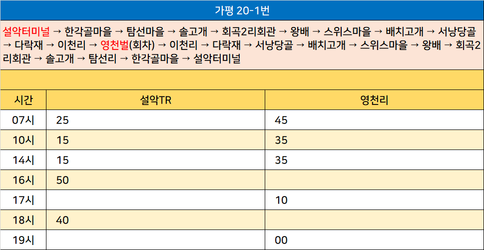 가평 20-1번: 설악터미널 → 한각골마을 → 탐선마을 → 솔고개 → 회곡2리회관 → 왕배 → 스위스마을 → 배치고개 → 서낭당골 → 다락재 → 이천리 → 영천벌(회차) → 이천리 → 다락재 → 서낭당골 → 배치고개 → 스위스마을 → 왕배 → 회곡2리회관 → 솔고개 → 탐선리 → 한각골마을 → 설악터미널