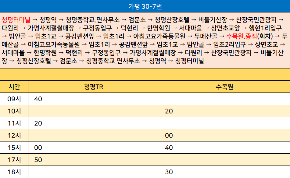 가평 30-7번: 청평터미널 → 청평역 → 청평중학교.면사무소 → 검문소 → 청평산장호텔 → 비둘기산장 → 산장국민관광지 → 다원리 → 가평사계절썰매장 → 구정동입구 → 덕현리 → 한명학원 → 서대마을 → 상면초교앞 → 행현1리입구 → 밤안골 → 임초1교 → 공감펜션앞 → 임초1리 → 아침고요가족동물원 → 두메산골 → 수목원.종점(회차) → 두메산골 → 아침고요가족동물원 → 임초1리 → 공감펜션앞 → 임초1교 → 밤안골 → 임초2리입구 → 상면초교 → 서대마을 → 한명학원 → 덕현리 → 구정동입구 → 가평사계절썰매장 → 다원리 → 산장국민관광지 → 비둘기산장 → 청평산장호텔 → 검문소 → 청평중학교.면사무소 → 청평역 → 청평터미널