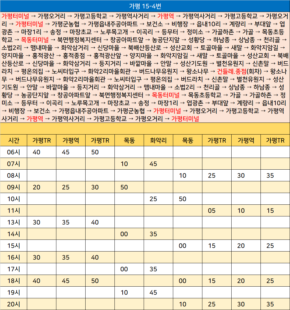 가평 15-4번: 가평터미널 → 가평오거리 → 가평고등학교 → 가평역사거리 → 가평역 → 가평역사거리 → 가평고등학교 → 가평오거리 → 가평터미널 → 가평군농협 → 가평읍내주공아파트 → 보건소 → 비행장 → 읍내10리 → 계량리 → 부대앞 → 엽광촌 → 마장1리 → 송정 → 마장초교 → 노루목고개 → 이곡리 → 등무터 → 정미소 → 가골하촌 → 가골 → 목동초등학교 → 목동터미널 → 북면행정복지센터 → 창공아파트앞 → 농공단지앞 → 성황당 → 하남종 → 상남종 → 천리골 → 소법2리 → 맴내마을 → 화악삼거리 → 신당마을 → 북배산등산로 → 성산교회 → 토골마을 → 새말 → 화악지암길 → 양지마을 → 홍적광산 → 홍적종점 → 홍적광산앞 → 양지마을 → 화악지암길 → 새말 → 토골마을 → 성산교회 → 북배산등산로 → 신당마을 → 화악삼거리 → 등지거리 → 바깥마을 → 안말 → 성산기도원 → 별천유원지 → 신촌말 → 버드라치 → 평온의집 → 노씨터입구 → 화악2리마을회관 → 버드나무유원지 → 왕소나무 → 건들레.종점(회차) → 왕소나무 → 버드나무유원지 → 화악2리마을회관 → 노씨터입구 → 평온의집 → 버드라치 → 신촌말 → 별천유원지 → 성산기도원 → 안말 → 바깥마을 → 등지거리 → 화악삼거리 → 맴내마을 → 소법2리 → 천리골 → 상남종 → 하남종 → 성황당 → 농공단지앞 → 창공아파트앞 → 북면행정복지센터 → 목동터미널 → 목동초등학교 → 가골 → 가골하촌 → 정미소 → 등무터 → 이곡리 → 노루목고개 → 마장초교 → 송정 → 마장1리 → 엽광촌 → 부대앞 → 계량리 → 읍내10리 → 비행장 → 보건소 → 가평읍내주공아파트 → 가평군농협 → 가평터미널 → 가평오거리 → 가평고등학교 → 가평역사거리 → 가평역 → 가평역사거리 → 가평고등학교 → 가평오거리 → 가평터미널