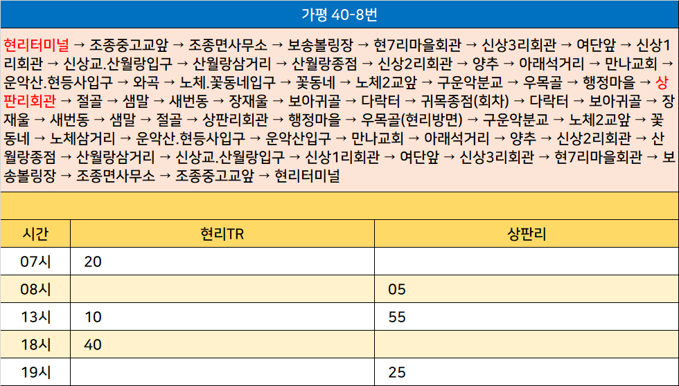 가평 40-8번: 현리터미널 → 조종중고교앞 → 조종면사무소 → 보송볼링장 → 현7리마을회관 → 신상3리회관 → 여단앞 → 신상1리회관 → 신상교.산월랑입구 → 산월랑삼거리 → 산월랑종점 → 신상2리회관 → 양추 → 아래석거리 → 만나교회 → 운악산.현등사입구 → 와곡 → 노체.꽃동네입구 → 꽃동네 → 노체2교앞 → 구운악분교 → 우목골 → 행정마을 → 상판리회관 → 절골 → 샘말 → 새번동 → 장재울 → 보아귀골 → 다락터 → 귀목종점(회차) → 다락터 → 보아귀골 → 장재울 → 새번동 → 샘말 → 절골 → 상판리회관 → 행정마을 → 우목골(현리방면) → 구운악분교 → 노체2교앞 → 꽃동네 → 노체삼거리 → 운악산.현등사입구 → 운악산입구 → 만나교회 → 아래석거리 → 양추 → 신상2리회관 → 산월랑종점 → 산월랑삼거리 → 신상교.산월랑입구 → 신상1리회관 → 여단앞 → 신상3리회관 → 현7리마을회관 → 보송볼링장 → 조종면사무소 → 조종중고교앞 → 현리터미널