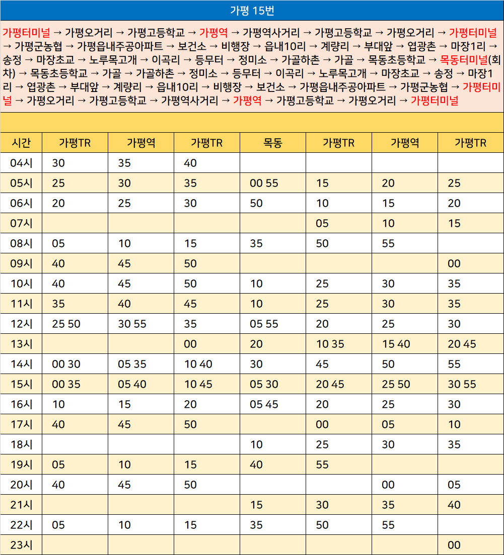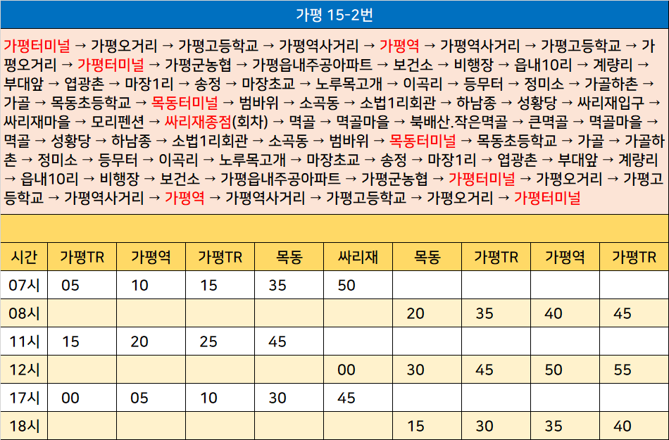 가평 15번: 가평터미널 → 가평오거리 → 가평고등학교 → 가평역 → 가평역사거리 → 가평고등학교 → 가평오거리 → 가평터미널 → 가평군농협 → 가평읍내주공아파트 → 보건소 → 비행장 → 읍내10리 → 계량리 → 부대앞 → 엽광촌 → 마장1리 → 송정 → 마장초교 → 노루목고개 → 이곡리 → 등무터 → 정미소 → 가골하촌 → 가골 → 목동초등학교 → 목동터미널(회차) → 목동초등학교 → 가골 → 가골하촌 → 정미소 → 등무터 → 이곡리 → 노루목고개 → 마장초교 → 송정 → 마장1리 → 엽광촌 → 부대앞 → 계량리 → 읍내10리 → 비행장 → 보건소 → 가평읍내주공아파트 → 가평군농협 → 가평터미널 → 가평오거리 → 가평고등학교 → 가평역사거리 → 가평역 → 가평고등학교 → 가평오거리 → 가평터미널