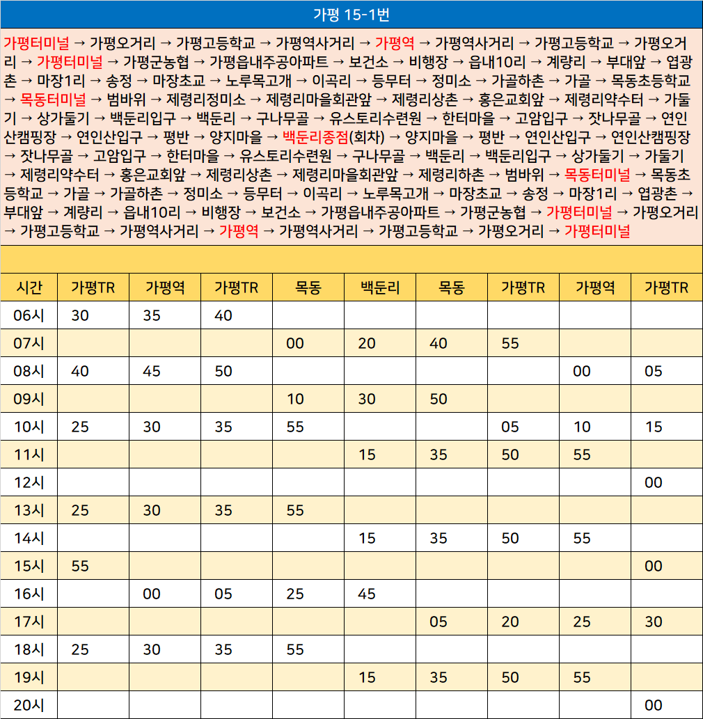 가평 15-1번: 가평터미널 → 가평오거리 → 가평고등학교 → 가평역사거리 → 가평역 → 가평역사거리 → 가평고등학교 → 가평오거리 → 가평터미널 → 가평군농협 → 가평읍내주공아파트 → 보건소 → 비행장 → 읍내10리 → 계량리 → 부대앞 → 엽광촌 → 마장1리 → 송정 → 마장초교 → 노루목고개 → 이곡리 → 등무터 → 정미소 → 가골하촌 → 가골 → 목동초등학교 → 목동터미널 → 범바위 → 제령리정미소 → 제령리마을회관앞 → 제령리상촌 → 홍은교회앞 → 제령리약수터 → 가둘기 → 상가둘기 → 백둔리입구 → 백둔리 → 구나무골 → 유스토리수련원 → 한터마을 → 고암입구 → 잣나무골 → 연인산캠핑장 → 연인산입구 → 평반 → 양지마을 → 백둔리종점(회차) → 양지마을 → 평반 → 연인산입구 → 연인산캠핑장 → 잣나무골 → 고암입구 → 한터마을 → 유스토리수련원 → 구나무골 → 백둔리 → 백둔리입구 → 상가둘기 → 가둘기 → 제령리약수터 → 홍은교회앞 → 제령리상촌 → 제령리마을회관앞 → 제령리하촌 → 범바위 → 목동터미널 → 목동초등학교 → 가골 → 가골하촌 → 정미소 → 등무터 → 이곡리 → 노루목고개 → 마장초교 → 송정 → 마장1리 → 엽광촌 → 부대앞 → 계량리 → 읍내10리 → 비행장 → 보건소 → 가평읍내주공아파트 → 가평군농협 → 가평터미널 → 가평오거리 → 가평고등학교 → 가평역사거리 → 가평역 → 가평역사거리 → 가평고등학교 → 가평오거리 → 가평터미널