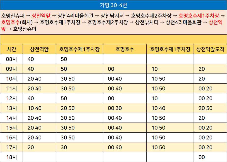 가평 30-4번: 호명산슈퍼 → 상천역앞 → 상천4리마을회관 → 상천낚시터 → 호명호수제2주차장 → 호명호수제1주차장 → 호명호수(회차) → 호명호수제1주차장 → 호명호수제2주차장 → 상천낚시터 → 상천4리마을회관 → 상천역앞 → 호명산슈퍼