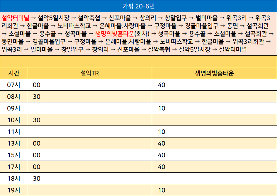 가평 20-6번: 설악터미널 → 설악5일시장 → 설악축협 → 산포마을 → 창의리 → 창말입구 → 벌미마을 → 위곡3리 → 위곡3리회관 → 한글마을 → 노비따스학교 → 은혜마을.사랑마을 → 구정마을 → 경골마을입구 → 동면 → 설곡회관 → 소설마을 → 용수골 → 성곡마을 → 생명의빛홈타운(회차) → 성곡마을 → 용수골 → 소설마을 → 설곡회관 → 동면마을 → 경골마을입구 → 구정마을 → 은혜마을.사랑마을 → 노비따스학교 → 한글마을 → 위곡3리회관 → 위곡3리 → 벌미마을 → 창말입구 → 창의리 → 신포마을 → 설악축협 → 설악5일시장 → 설악터미널