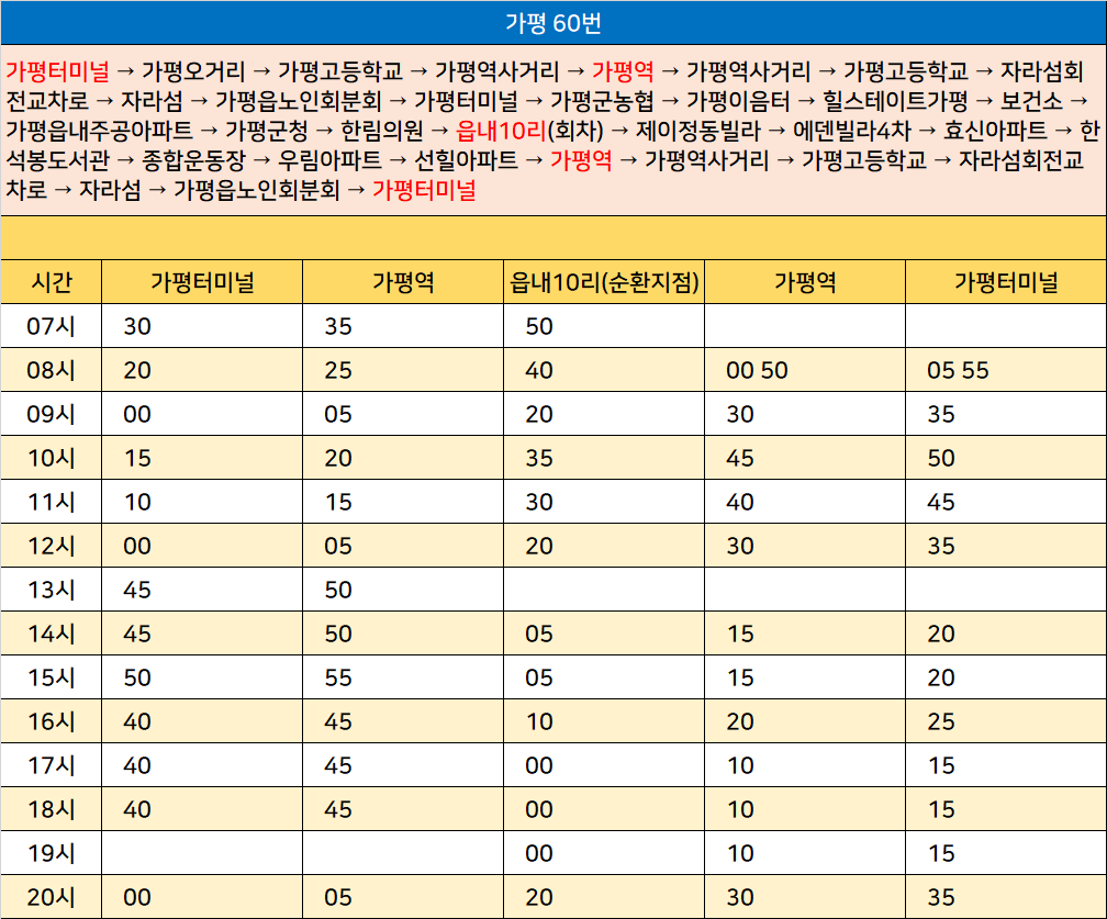 가평 60번: 가평터미널 → 가평오거리 → 가평고등학교 → 가평역사거리 → 가평역 → 가평역사거리 → 가평고등학교 → 자라섬회전교차로 → 자라섬 → 가평읍노인회분회 → 가평터미널 → 가평군농협 → 가평이음터 → 힐스테이트가평 → 보건소 → 가평읍내주공아파트 → 가평군청 → 한림의원 → 읍내10리(회차) → 제이정동빌라 → 에덴빌라4차 → 효신아파트 → 한석봉도서관 → 종합운동장 → 우림아파트 → 선힐아파트 → 가평역 → 가평역사거리 → 가평고등학교 → 자라섬회전교차로 → 자라섬 → 가평읍노인회분회 → 가평터미널