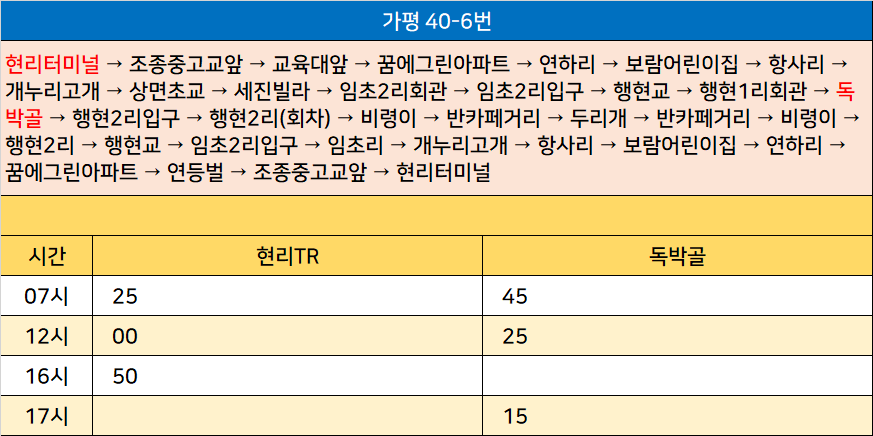 가평 40-6번: 현리터미널 → 조종중고교앞 → 교육대앞 → 꿈에그린아파트 → 연하리 → 보람어린이집 → 항사리 → 개누리고개 → 상면초교 → 세진빌라 → 임초2리회관 → 임초2리입구 → 행현교 → 행현1리회관 → 독박골 → 행현2리입구 → 행현2리(회차) → 비령이 → 반카페거리 → 두리개 → 반카페거리 → 비령이 → 행현2리 → 행현교 → 임초2리입구 → 임초리 → 개누리고개 → 항사리 → 보람어린이집 → 연하리 → 꿈에그린아파트 → 연등벌 → 조종중고교앞 → 현리터미널