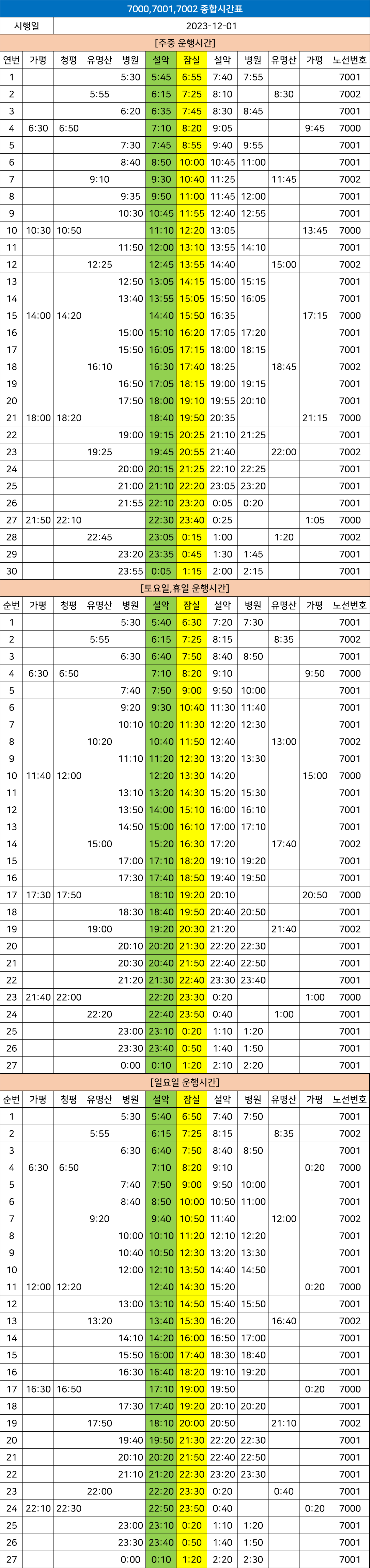 가평 7002번: 유명산종점 → 가일리삼거리 → 가일리.동천마을 → 가일1리 → 전위골 → 방일리 → 천안1리뇌암 → 불기마을 → 천안1리 → 한우재 → 속골 → 엄소리입구 → 신천4리인내 → 윗벌 → 명장삼거리 → 명장마을(설악방향) → 설악터미널 → 설악5일시장 → 설악보건지소 → 한교막(양평방면) → 잠실역.롯데월드(회차) → 한교막 → 설악보건지소 → 설악5일시장 → 설악터미널 → 명장마을(양평방향) → 명장삼거리 → 윗벌 → 인내 → 엄소리입구 → 속골 → 한우재 → 뽕나무거리 → 불기마을 → 천안1리 → 방일리 → 전위골 → 가일1리 → 가일리 → 가일리삼거리 → 유명산종점