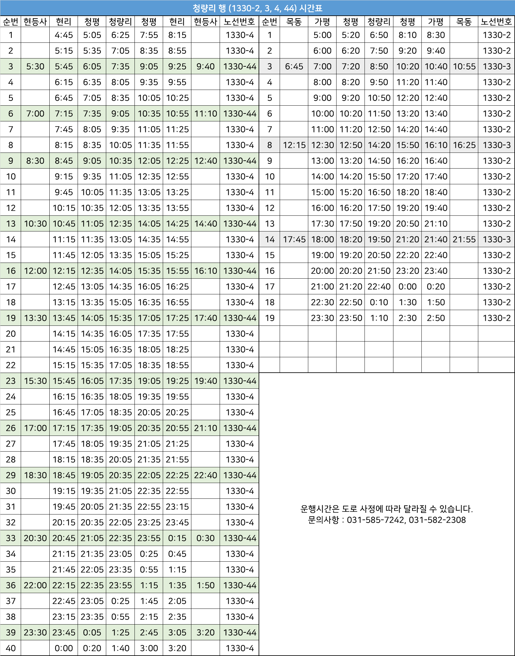 가평 1330-4번: 현리터미널 → 조종중고교앞 → 교육대앞 → 꿈에그린아파트 → 연하리 → 항사리 → 개누리고개 → 상면초교 → 서대마을 → 한명학원 → 덕현리 → 구정동입구 → 가평사계절썰매장 → 비둘기산장 → 검문소 → 청평중학교 → 청평터미널 → 청평농협 → 시장입구 → 팔각정 → 윗소돌말 → 소돌마을 → 중앙기도원 → 원대성리 → 관터마을 → 대성리역 → 대성리MT장 → 외구운마을 → 구암동산응암마을 → 진벌마을 → 돌고개신포마을 → 답내초교입구 → 월산지구부영1.2단지입구 → 화광중학교.월산리 → 지현마을.남양주고등학교.화도동부출장소 → 모란공원.마석그랜드힐아파트 → 마석역 → 청소년도움센터 → 금강주택 → 보학마을.라온프라이빗아파트 → 삼신아파트 → 남양주세무서.천마산수련장 → 마석가구공단.천마산스키장입구 → 천마산휴게소.한누리요양병원 → 경성아파트 → 효성해링턴플레이스.구룡터 → 두산알프하임입구 → 평내호평역 → 평내농협.평내초교.대명루첸 → 평내동주민센터.남양주우체국 → 평내문화촌마을 → 남양주시청 → 금곡동구종점 → 양병원.이석영광장.남양주고용복지플러스센터 → 금곡동주민센터.인정프린스.남양주시자원봉사센터 → 진안사거리 → 남양주남부경찰서.남양주제2청사.보건소.교육지원청 → 다산2동주민센터.양정초.한화아파트(중) → 도농역.동화중고교.다산플루리움(중) → 가운휴먼시아.다산효성해링턴타워.새마을금고다산본점(중) → 롯데백화점.구리역입구(청량리.인창동방면)(중) → 돌다리.구리전통시장(중) → 한양대구리병원(중) → 교문사거리(중) → 딸기원(중) → 동부제일병원.망우리공원(중) → 금란교회 → 우림시장.망우사거리(중) → 망우역.망우지구대 → 망우역.상봉터미널(중) → 상봉역.중랑우체국(중) → 중랑역.동부시장(중) → 중랑교(중) → 삼육서울병원(중) → 시조사삼거리(중) → 청랑리한신아파트.청량사입구 → 현대코아(회차) → 청량리역환승센터(1번승강장) → 청량리미주상가앞 → 서울성심병원 → 삼육서울병원(중) → 중랑교(중) → 중랑역.동부시장(중) → 상봉역.중랑우체국(중) → 망우역.상봉터미널(중) → 망우역.망우지구대(중) → 우림시장.망우사거리(중) → 금란교회(중) → 동부제일병원.망우리공원(중) → 딸기원(중) → 교문사거리(중) → 한양대구리병원.새마을금고(중) → 돌다리.구리전통시장(중) → 롯데백화점.구리역입구(중) → 가운휴먼시아.다산효성해링턴타워.새마을금고다산본점(중) → 도농역.동화중고교.다산플루리움(중) → 다산2동주민센터.양정초.한화아파트(중) → 남양주남부경찰서.남양주제2청사.보건소.교육지원청 → 진안사거리 → 금곡동주민센터.인정프린스.남양주시자원봉사센터 → 홍유릉.이석영광장.남양주고용복지플러스센터 → 홍유능후문앞 → 금곡중고등학교 → 남양주시청 → 평내상업지구 → 평내동주민센터.남양주우체국 → 평내농협.평내초교.대명루첸 → 평내호평역 → 두산알프하임입구 → 구룡터.효성해링턴플레이스 → 경성아파트 → 천마산휴게소.한누리요양병원 → 마석가구공단.천마산스키장입구 → 남양주세무서.천마산수련장 → 삼신아파트 → 보학마을.라온프라이빗아파트 → 금강주택 → 청소년도움센터 → 마석역 → 모란공원.마석그랜드힐아파트 → 지현마을.남양주고등학교.화도동부출장소 → 화광중학교 → 월산지구부영1.2단지입구 → 답내초교입구 → 화도낚시터.돌고개 → 진벌마을 → 구암동산 → 외구운마을 → 대성리MT장 → 대성리역 → 채석장 → 원대성리 → 중앙기도원 → 한얼산기도원 → 대성1리 → 팔각정 → 청평고등학교.청수아파트 → 삼거리.시장 → 청평농협 → 청평터미널 → 청평중학교 → 검문소 → 비둘기산장 → 가평사계절썰매장 → 구정동입구 → 덕현리 → 한명학원 → 서대마을 → 임초리 → 개누리고개 → 항사리 → 연하리 → 꿈에그린아파트 → 연등벌 → 조종중고교앞 → 현리터미널