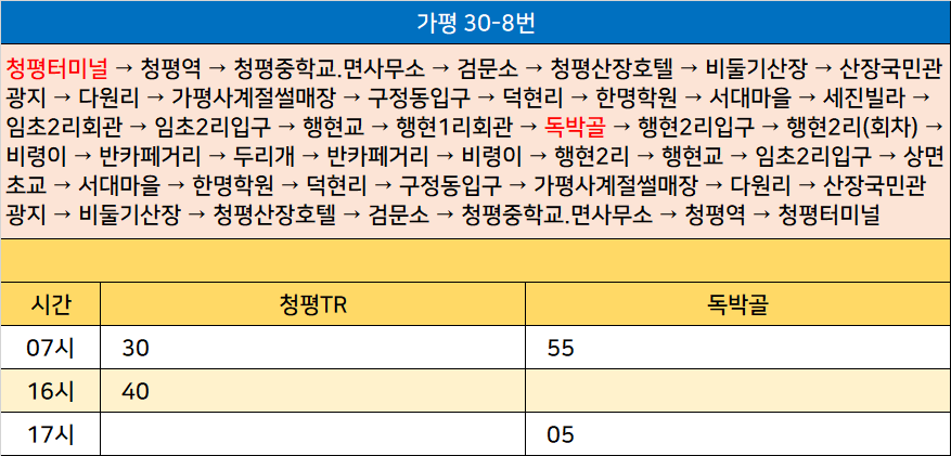 가평 30-8번: 청평터미널 → 청평역 → 청평중학교.면사무소 → 검문소 → 청평산장호텔 → 비둘기산장 → 산장국민관광지 → 다원리 → 가평사계절썰매장 → 구정동입구 → 덕현리 → 한명학원 → 서대마을 → 세진빌라 → 임초2리회관 → 임초2리입구 → 행현교 → 행현1리회관 → 독박골 → 행현2리입구 → 행현2리(회차) → 비령이 → 반카페거리 → 두리개 → 반카페거리 → 비령이 → 행현2리 → 행현교 → 임초2리입구 → 상면초교 → 서대마을 → 한명학원 → 덕현리 → 구정동입구 → 가평사계절썰매장 → 다원리 → 산장국민관광지 → 비둘기산장 → 청평산장호텔 → 검문소 → 청평중학교.면사무소 → 청평역 → 청평터미널