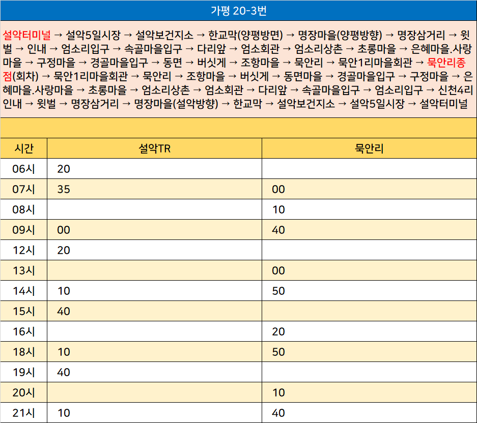 가평 20-3번: 설악터미널 → 설악5일시장 → 설악보건지소 → 한교막(양평방면) → 명장마을(양평방향) → 명장삼거리 → 윗벌 → 인내 → 엄소리입구 → 속골마을입구 → 다리앞 → 엄소회관 → 엄소리상촌 → 초롱마을 → 은혜마을.사랑마을 → 구정마을 → 경골마을입구 → 동면 → 버싯게 → 조항마을 → 묵안리 → 묵안1리마을회관 → 묵안리종점(회차) → 묵안1리마을회관 → 묵안리 → 조항마을 → 버싯게 → 동면마을 → 경골마을입구 → 구정마을 → 은혜마을.사랑마을 → 초롱마을 → 엄소리상촌 → 엄소회관 → 다리앞 → 속골마을입구 → 엄소리입구 → 신천4리인내 → 윗벌 → 명장삼거리 → 명장마을(설악방향) → 한교막 → 설악보건지소 → 설악5일시장 → 설악터미널