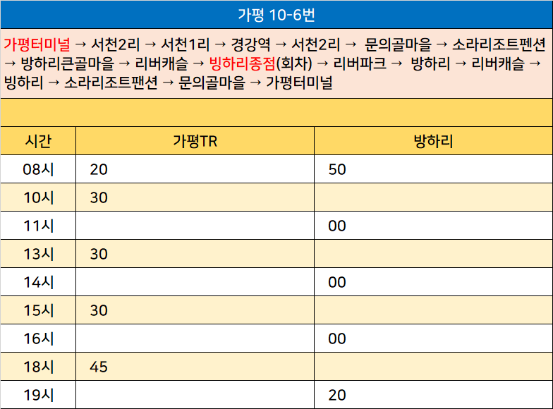 가평 10-6번: 가평터미널 → 서천2리 → 서천1리 → 경강역 → 서천2리 → 문의골마을 → 소라리조트펜션 → 방하리큰골마을 → 리버캐슬 → 빙하리종점(회차) → 리버파크 → 방하리 → 리버캐슬 → 빙하리 → 소라리조트팬션 → 문의골마을 → 가평터미널