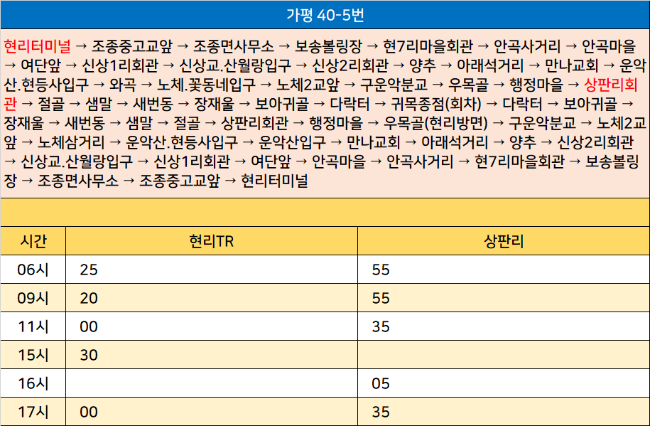 가평 40-5번: 현리터미널 → 조종중고교앞 → 조종면사무소 → 보송볼링장 → 현7리마을회관 → 안곡사거리 → 안곡마을 → 여단앞 → 신상1리회관 → 신상교.산월랑입구 → 신상2리회관 → 양추 → 아래석거리 → 만나교회 → 운악산.현등사입구 → 와곡 → 노체.꽃동네입구 → 노체2교앞 → 구운악분교 → 우목골 → 행정마을 → 상판리회관 → 절골 → 샘말 → 새번동 → 장재울 → 보아귀골 → 다락터 → 귀목종점(회차) → 다락터 → 보아귀골 → 장재울 → 새번동 → 샘말 → 절골 → 상판리회관 → 행정마을 → 우목골(현리방면) → 구운악분교 → 노체2교앞 → 노체삼거리 → 운악산.현등사입구 → 운악산입구 → 만나교회 → 아래석거리 → 양추 → 신상2리회관 → 신상교.산월랑입구 → 신상1리회관 → 여단앞 → 안곡마을 → 안곡사거리 → 현7리마을회관 → 보송볼링장 → 조종면사무소 → 조종중고교앞 → 현리터미널