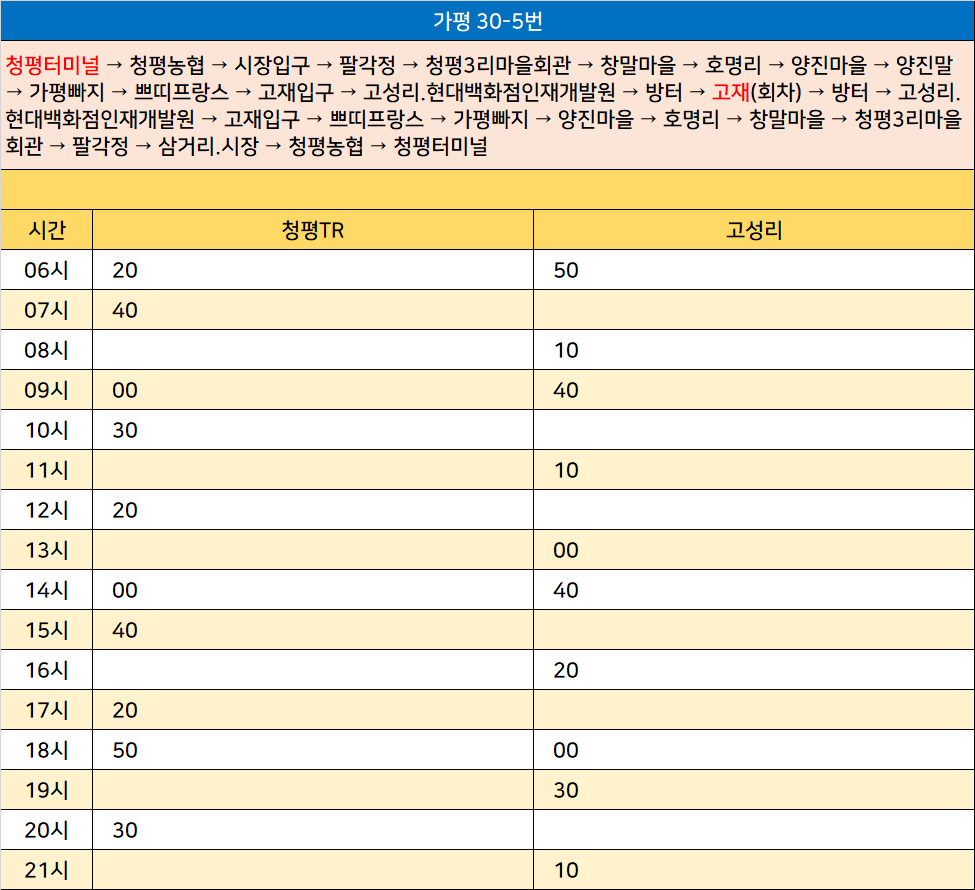 가평 30-5번: 청평터미널 → 청평농협 → 시장입구 → 팔각정 → 청평3리마을회관 → 창말마을 → 호명리 → 양진마을 → 양진말 → 가평빠지 → 쁘띠프랑스 → 고재입구 → 고성리.현대백화점인재개발원 → 방터 → 고재(회차) → 방터 → 고성리.현대백화점인재개발원 → 고재입구 → 쁘띠프랑스 → 가평빠지 → 양진마을 → 호명리 → 창말마을 → 청평3리마을회관 → 팔각정 → 삼거리.시장 → 청평농협 → 청평터미널