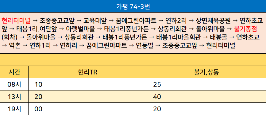 가평 74-3번: 현리터미널 → 조종중고교앞 → 교육대앞 → 꿈에그린아파트 → 연하2리 → 상면체육공원 → 연하초교앞 → 태봉1리.여단앞 → 아랫벌마을 → 태봉1리풍년가든 → 상동리회관 → 돌아위마을 → 불기종점(회차) → 돌아위마을 → 상동리회관 → 태봉1리풍년가든 → 태봉1리마을회관 → 태봉골 → 연하초교 → 역촌 → 연하1리 → 연하리 → 꿈에그린아파트 → 연등벌 → 조종중고교앞 → 현리터미널