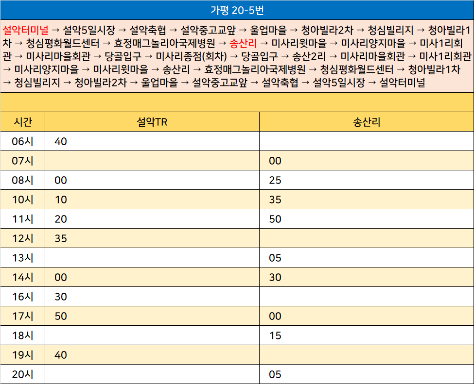 가평 20-5번: 설악터미널 → 설악5일시장 → 설악축협 → 설악중고교앞 → 울업마을 → 청아빌라2차 → 청심빌리지 → 청아빌라1차 → 청심평화월드센터 → 효정매그놀리아국제병원 → 송산리 → 미사리윗마을 → 미사리양지마을 → 미사1리회관 → 미사리마을회관 → 당골입구 → 미사리종점(회차) → 당골입구 → 송산2리 → 미사리마을회관 → 미사1리회관 → 미사리양지마을 → 미사리윗마을 → 송산리 → 효정매그놀리아국제병원 → 청심평화월드센터 → 청아빌라1차 → 청심빌리지 → 청아빌라2차 → 울업마을 → 설악중고교앞 → 설악축협 → 설악5일시장 → 설악터미널