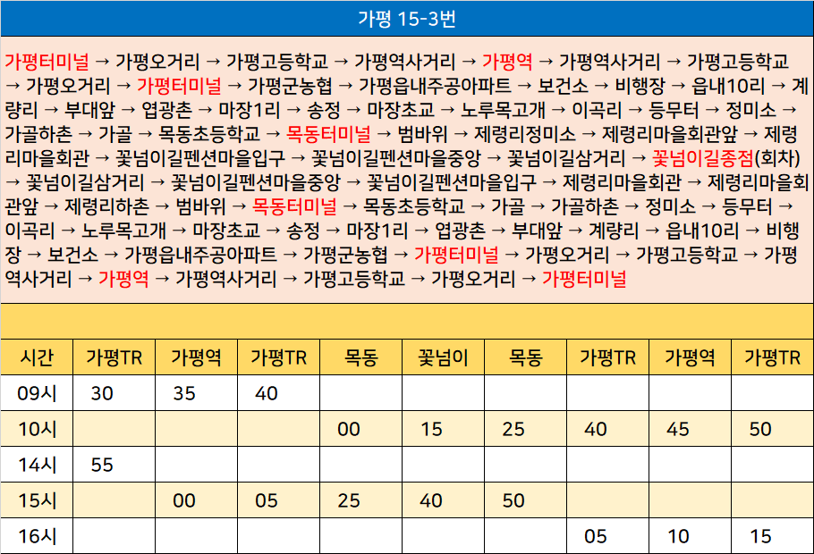 가평 15-3번: 가평터미널 → 가평오거리 → 가평고등학교 → 가평역사거리 → 가평역 → 가평역사거리 → 가평고등학교 → 가평오거리 → 가평터미널 → 가평군농협 → 가평읍내주공아파트 → 보건소 → 비행장 → 읍내10리 → 계량리 → 부대앞 → 엽광촌 → 마장1리 → 송정 → 마장초교 → 노루목고개 → 이곡리 → 등무터 → 정미소 → 가골하촌 → 가골 → 목동초등학교 → 목동터미널 → 범바위 → 제령리정미소 → 제령리마을회관앞 → 제령리마을회관 → 꽃넘이길펜션마을입구 → 꽃넘이길펜션마을중앙 → 꽃넘이길삼거리 → 꽃넘이길종점(회차) → 꽃넘이길삼거리 → 꽃넘이길펜션마을중앙 → 꽃넘이길펜션마을입구 → 제령리마을회관 → 제령리마을회관앞 → 제령리하촌 → 범바위 → 목동터미널 → 목동초등학교 → 가골 → 가골하촌 → 정미소 → 등무터 → 이곡리 → 노루목고개 → 마장초교 → 송정 → 마장1리 → 엽광촌 → 부대앞 → 계량리 → 읍내10리 → 비행장 → 보건소 → 가평읍내주공아파트 → 가평군농협 → 가평터미널 → 가평오거리 → 가평고등학교 → 가평역사거리 → 가평역 → 가평역사거리 → 가평고등학교 → 가평오거리 → 가평터미널
