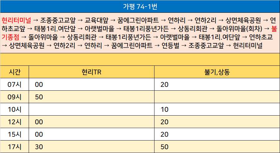 가평 74-1번: 현리터미널 → 조종중고교앞 → 교육대앞 → 꿈에그린아파트 → 연하리 → 연하2리 → 상면체육공원 → 연하초교앞 → 태봉1리.여단앞 → 아랫벌마을 → 태봉1리풍년가든 → 상동리회관 → 돌아위마을(회차) → 불기종점 → 돌아위마을 → 상동리회관 → 태봉1리풍년가든 → 아랫벌마을 → 태봉1리.여단앞 → 연하초교 → 상면체육공원 → 연하2리 → 연하리 → 꿈에그린아파트 → 연등벌 → 조종중고교앞 → 현리터미널