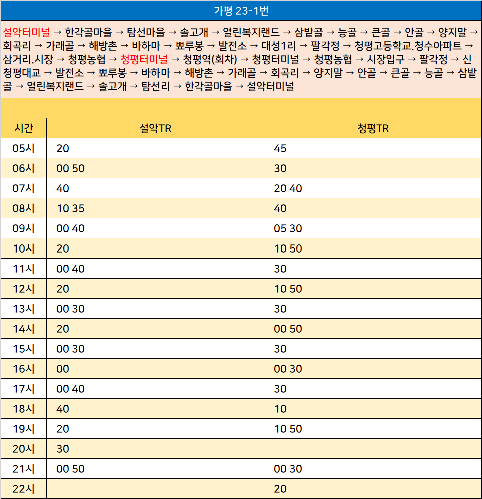 가평 23-1번: 설악터미널 → 한각골마을 → 탐선마을 → 솔고개 → 열린복지랜드 → 삼밭골 → 능골 → 큰골 → 안골 → 양지말 → 회곡리 → 가래골 → 해방촌 → 바하마 → 뾰루봉 → 발전소 → 대성1리 → 팔각정 → 청평고등학교.청수아파트 → 삼거리.시장 → 청평농협 → 청평터미널 → 청평역(회차) → 청평터미널 → 청평농협 → 시장입구 → 팔각정 → 신청평대교 → 발전소 → 뾰루봉 → 바하마 → 해방촌 → 가래골 → 회곡리 → 양지말 → 안골 → 큰골 → 능골 → 삼밭골 → 열린복지랜드 → 솔고개 → 탐선리 → 한각골마을 → 설악터미널