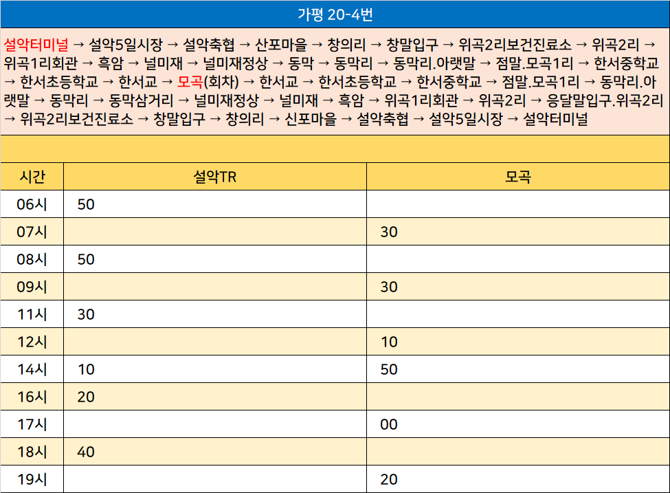 가평 20-4번: 설악터미널 → 설악5일시장 → 설악축협 → 산포마을 → 창의리 → 창말입구 → 위곡2리보건진료소 → 위곡2리 → 위곡1리회관 → 흑암 → 널미재 → 널미재정상 → 동막 → 동막리 → 동막리.아랫말 → 점말.모곡1리 → 한서중학교 → 한서초등학교 → 한서교 → 모곡(회차) → 한서교 → 한서초등학교 → 한서중학교 → 점말.모곡1리 → 동막리.아랫말 → 동막리 → 동막삼거리 → 널미재정상 → 널미재 → 흑암 → 위곡1리회관 → 위곡2리 → 응달말입구.위곡2리 → 위곡2리보건진료소 → 창말입구 → 창의리 → 신포마을 → 설악축협 → 설악5일시장 → 설악터미널